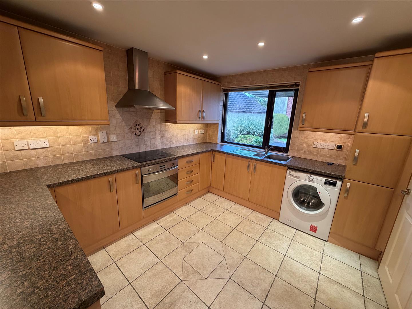 Range of beech high and low level cupboards and drawers with roll edge work surfaces. Built-in Smeg ceramic 4 ring hob and oven under. Extractor canopy with integrated fan and light. 11/2 tub single drainer stainless steel sink unit with mixer taps. Plumbed for washing machine. Integrated fridge. Part tiled walls. Ceramic tiled floor. TV point. 6 Downlights. Concealed lighting.