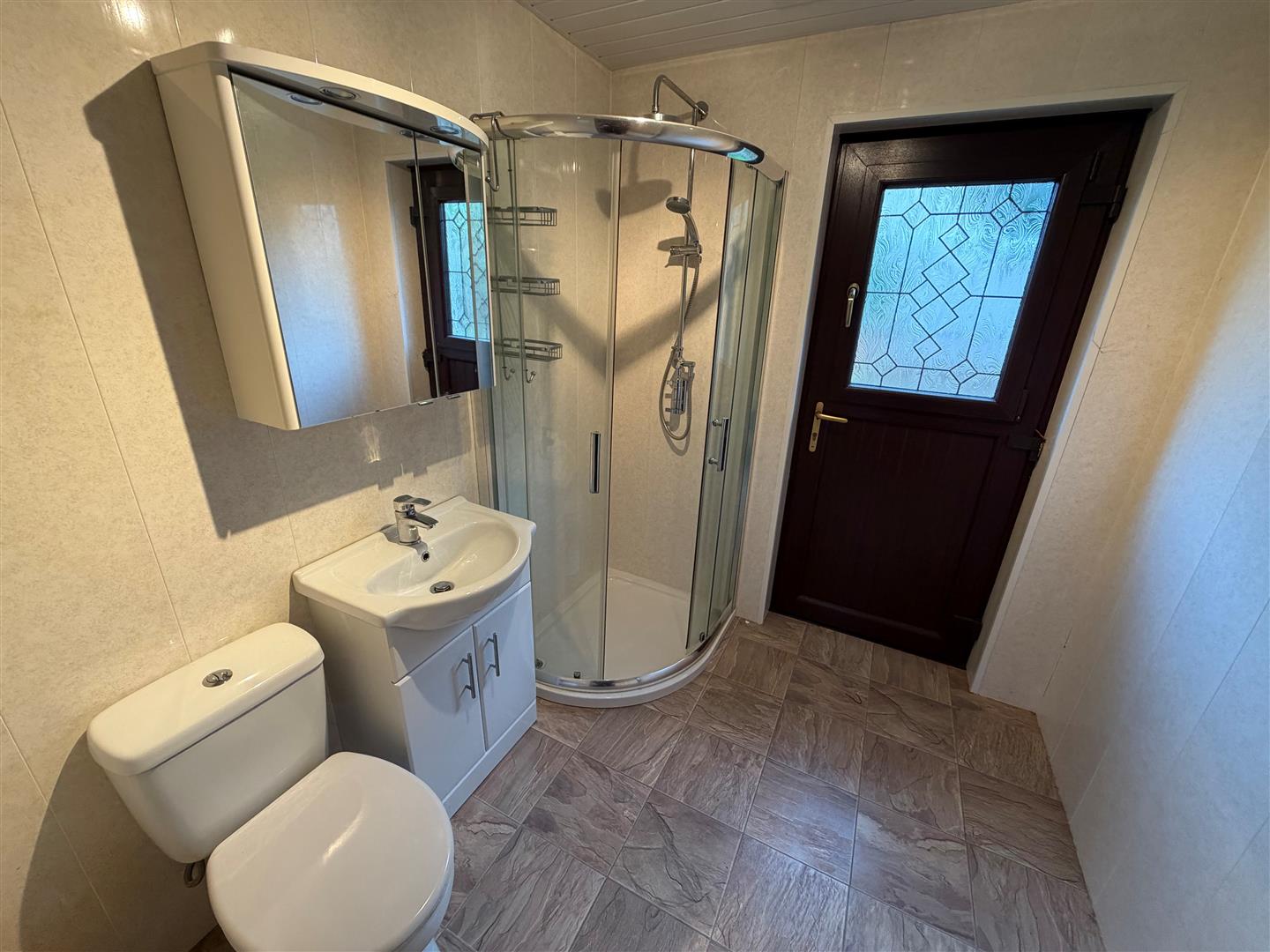 Comprising: Corner shower with Thermostatic shower and Drencher. Vanity unit with inset wash hand basin and mixer taps. W.C. PVC panelled walls and ceiling. Tiled effect laminated wood floor.