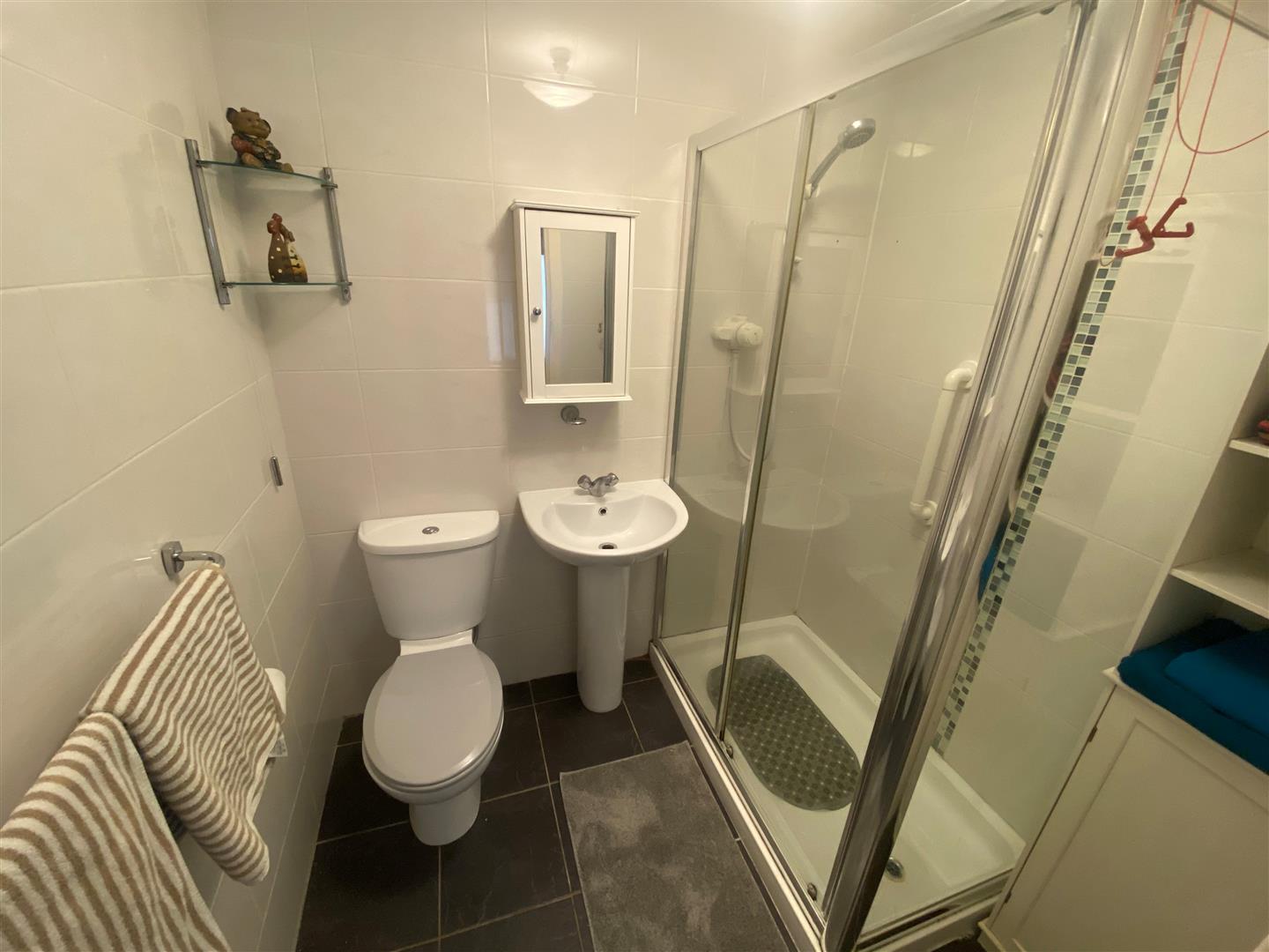 Comprising: Corner tiled shower cubicle with Aqualisha shower over. Pedestal wash hand basin. W.C. Tiled walls. Ceramic tiled floor. Built-in extractor fan.