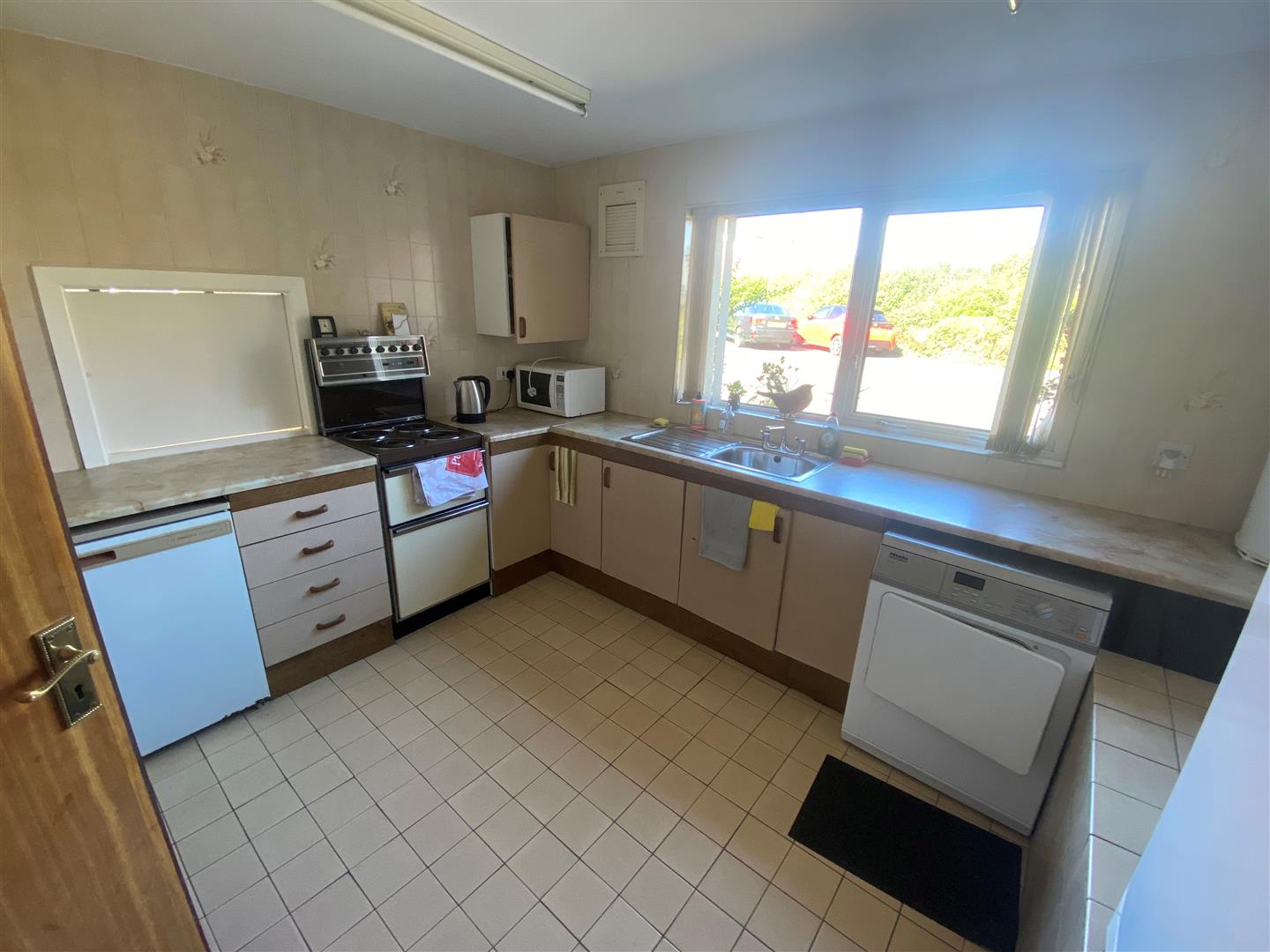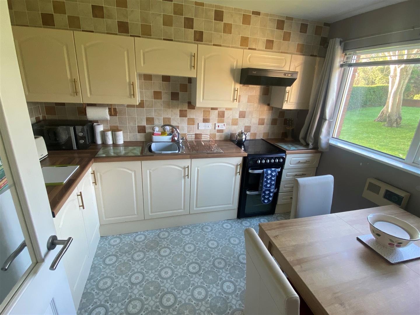 Range of hand painted high and low level cupboards and drawers with oak effect roll edge work surfaces. Built-in extractor fan. Single drainer stainless steel sink unit with mixer taps. Part tiled walls.