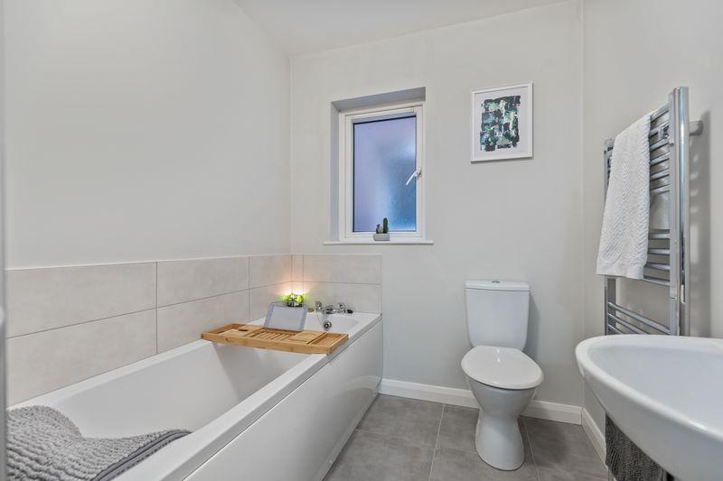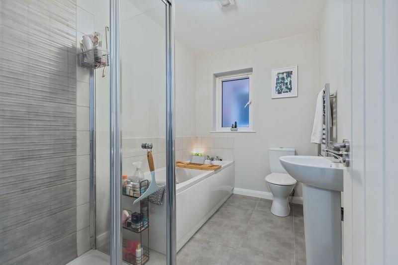 White suite comprising: Panelled bath with mixer taps. Low flush W.C. Pedestal wash hand basin with tiled splash back. Tiled shower cubicle with shower. Extractor fan. Tiled floor. Wall mounted heated towel rail.