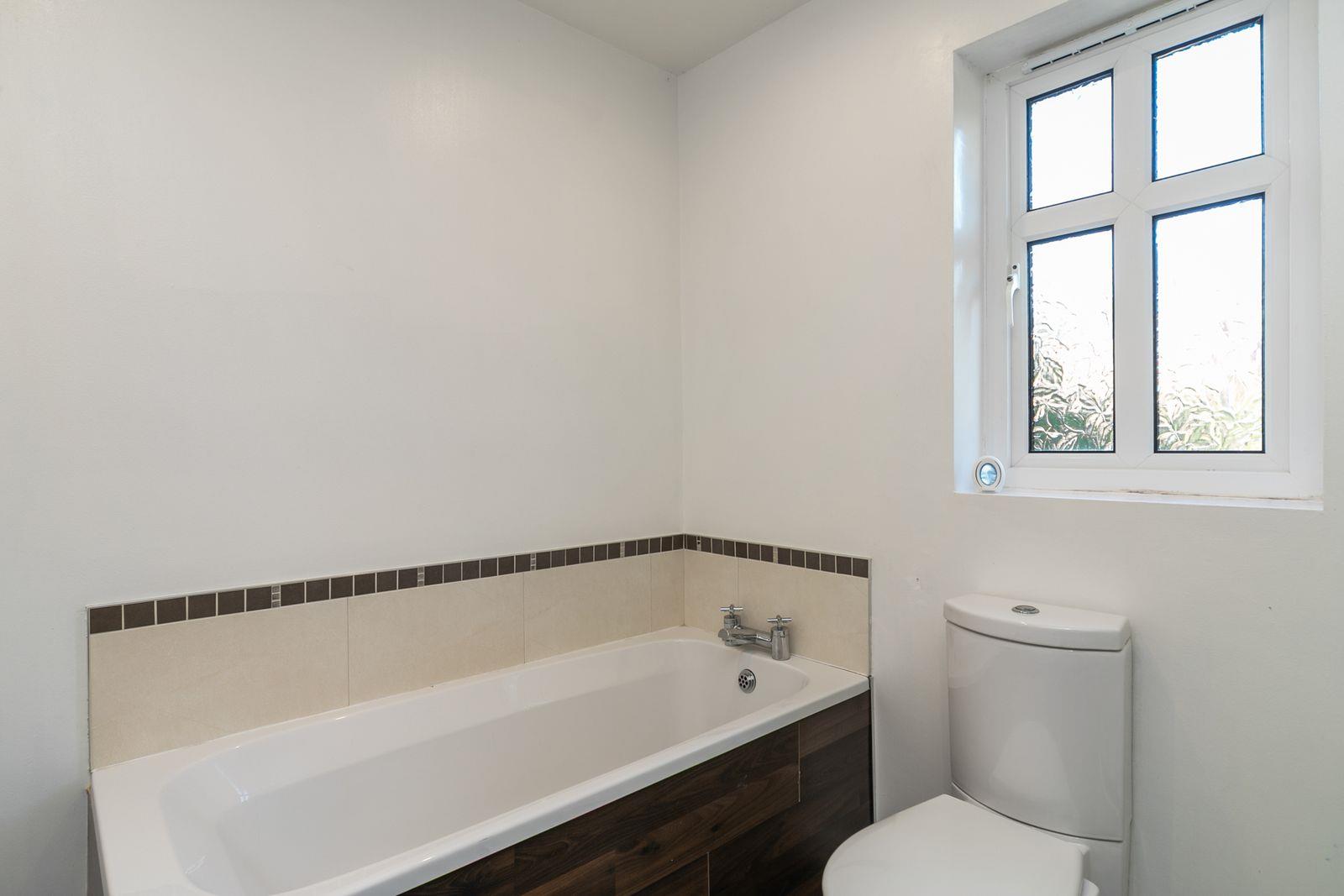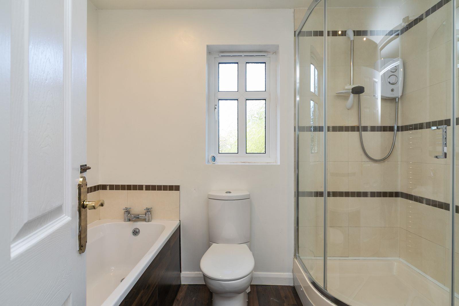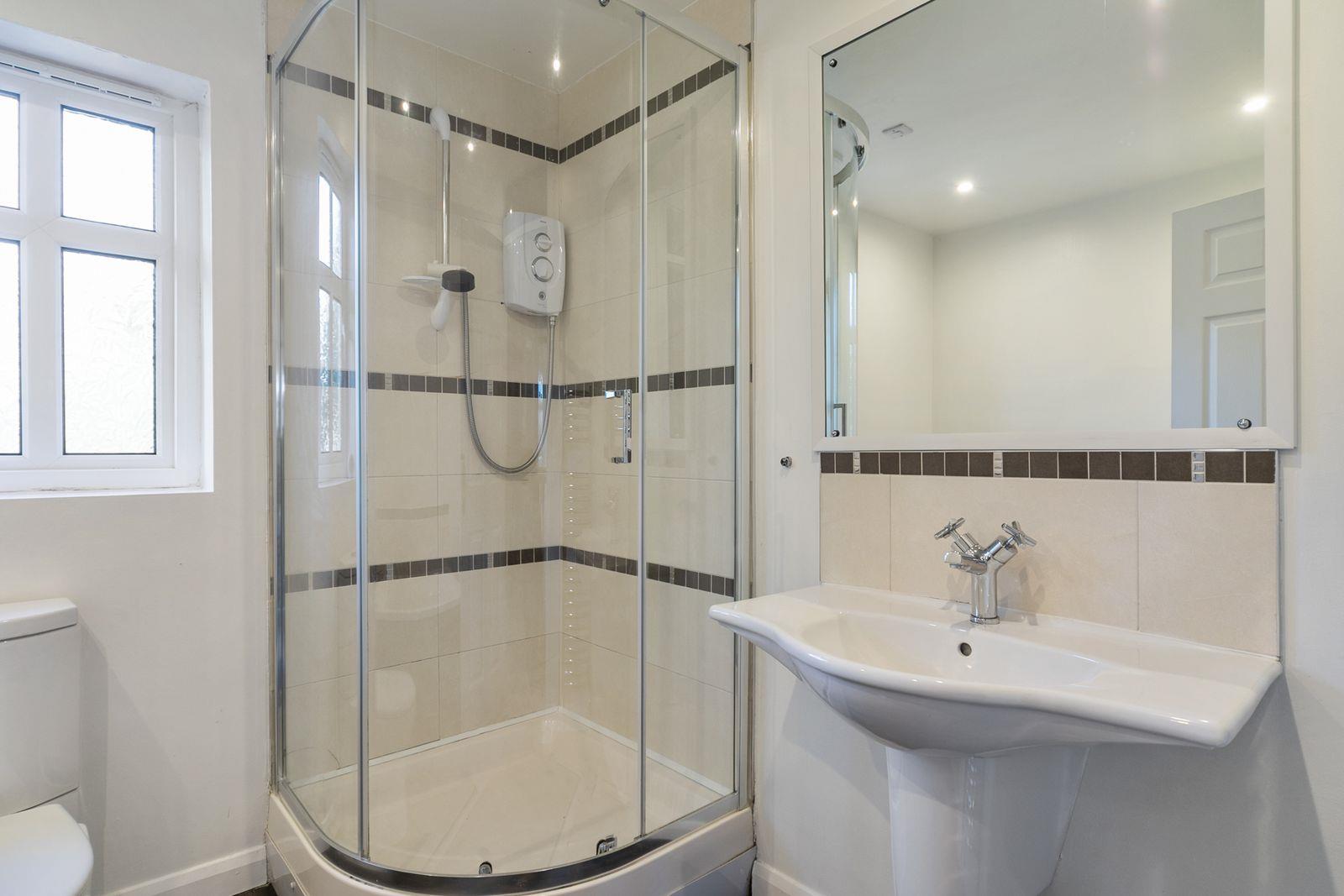 Comprising: Panelled bath. Corner shower cubicle with electric shower. W.C. Semi pedestal wash hand basin. W.C . Laminated wooden floor. Downlights.