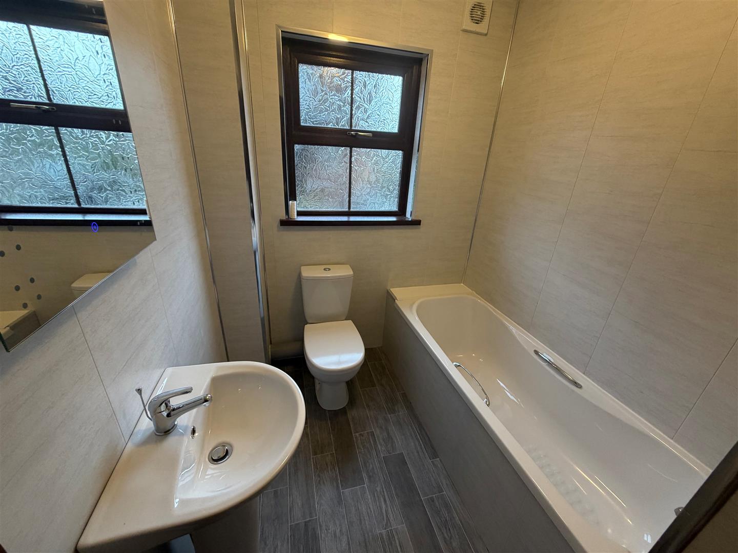 White suite comprising: Panelled bath with mixer taps and thermostatic shower. Pedestal wash hand basin with mixer taps. W.C. Panelled walls.