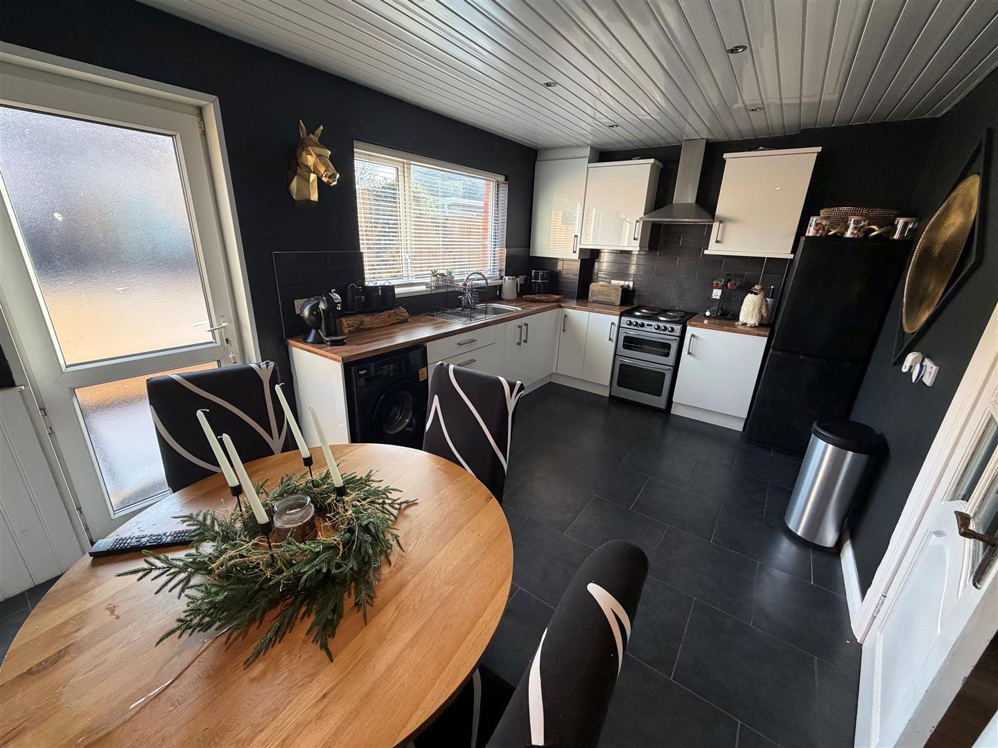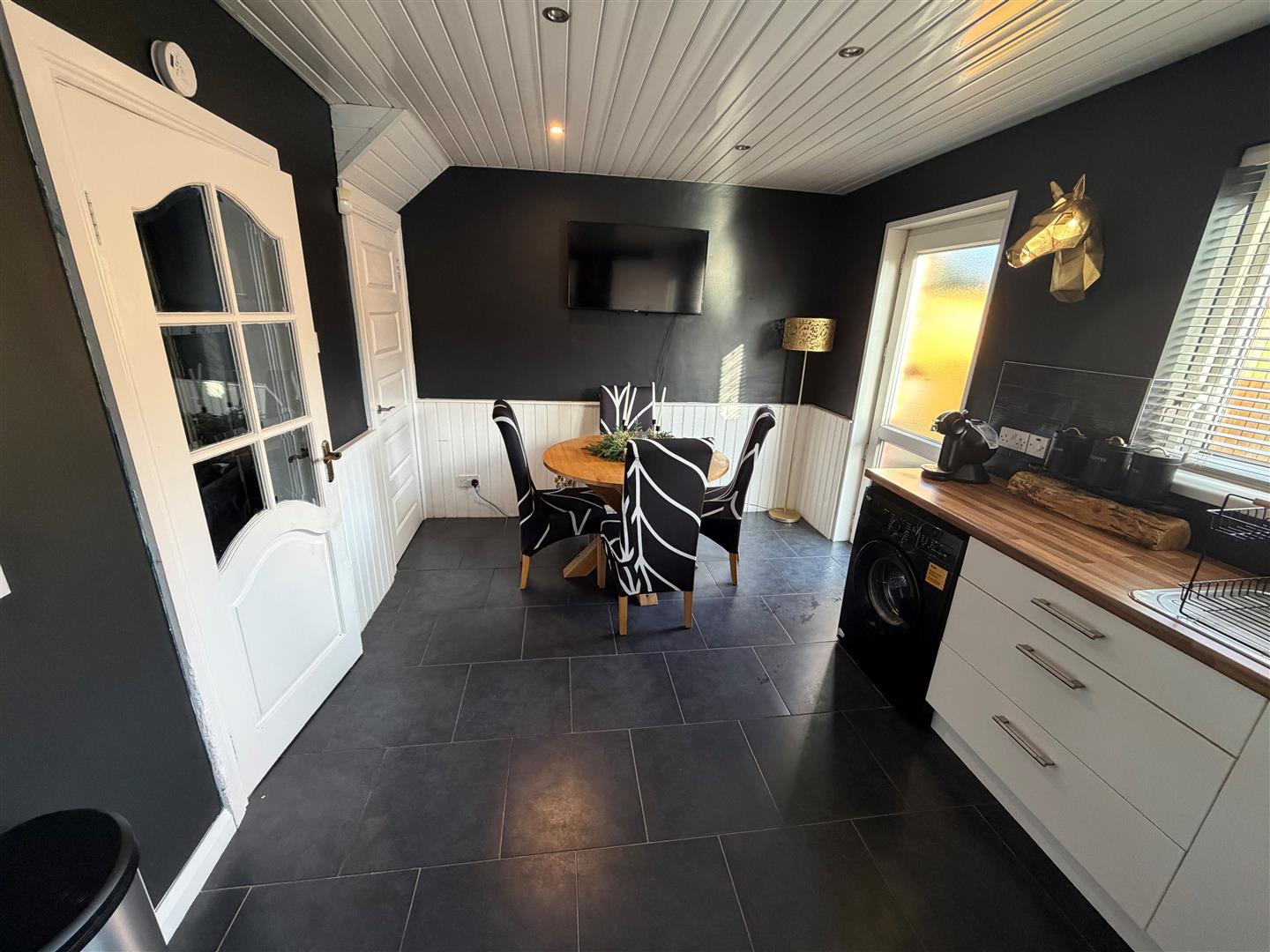 Range of white gloss high and low level cupboards and drawers with Walnut roll edge work surfaces, Extractor hood with integrated fan and light. Single drainer stainless steel sink unit with mixer taps. Plumbed for washing machine. Part tiled walls. Ceramic tiled floor. PVC ceiling with 8 Downlights. Understairs storage cupboard.