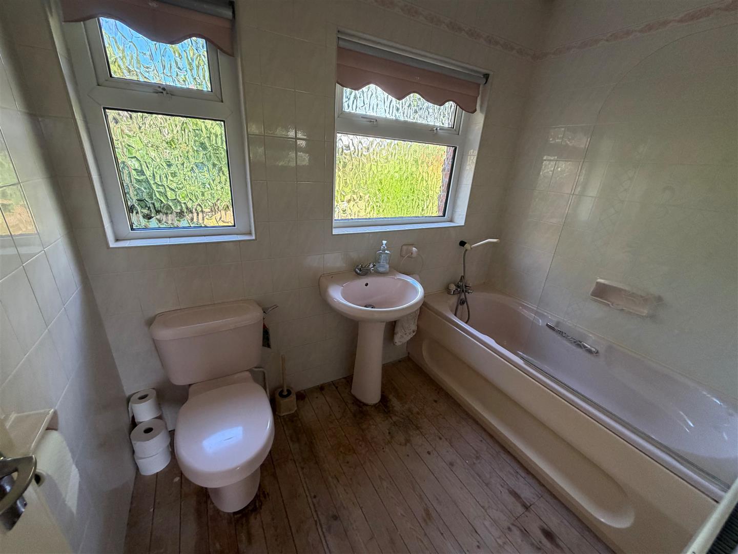 Coloured suite comprising: Panelled bath with mixer tap and telephone shower attachment, Mira thermostatic shower over. Pedestal wash hand basin. W.C. Tiled walls.