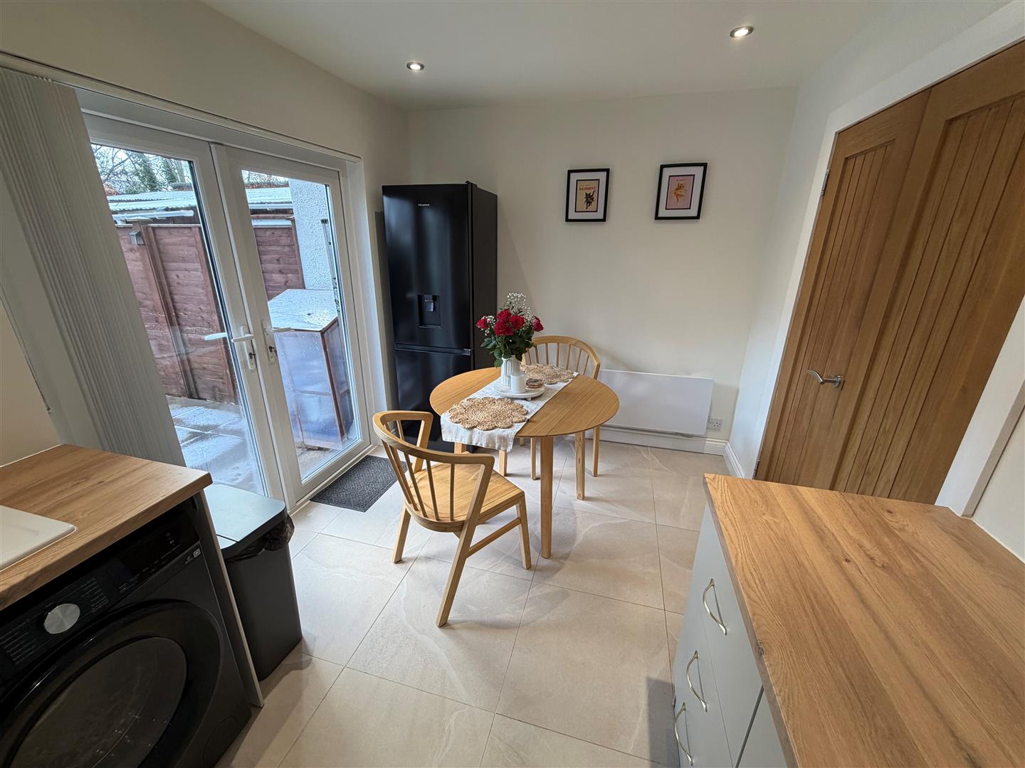 Range of high and low level cupboards and drawers with square edge work surfaces. Extractor hood with integrated fan and light. Single drainer sink unit with mixer taps. Plumbed for washing machine. uPVC double glazed French doors leading to rear.