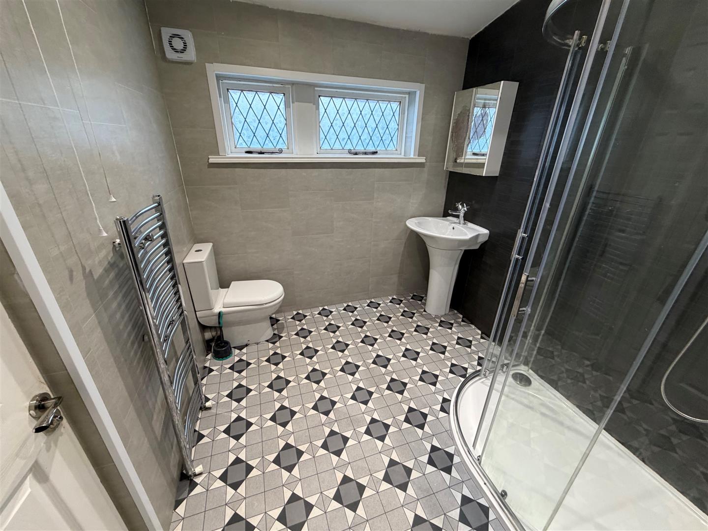 White Suite : Spacious shower cubicle with shower and drencher. Pedestal wash hand basin. Low Flush W.C. Wall mounted heated towel rail. Panelled walls. Ceiling downlights. Wooden single glazed windows. Adjacent walk in store room with shelving.