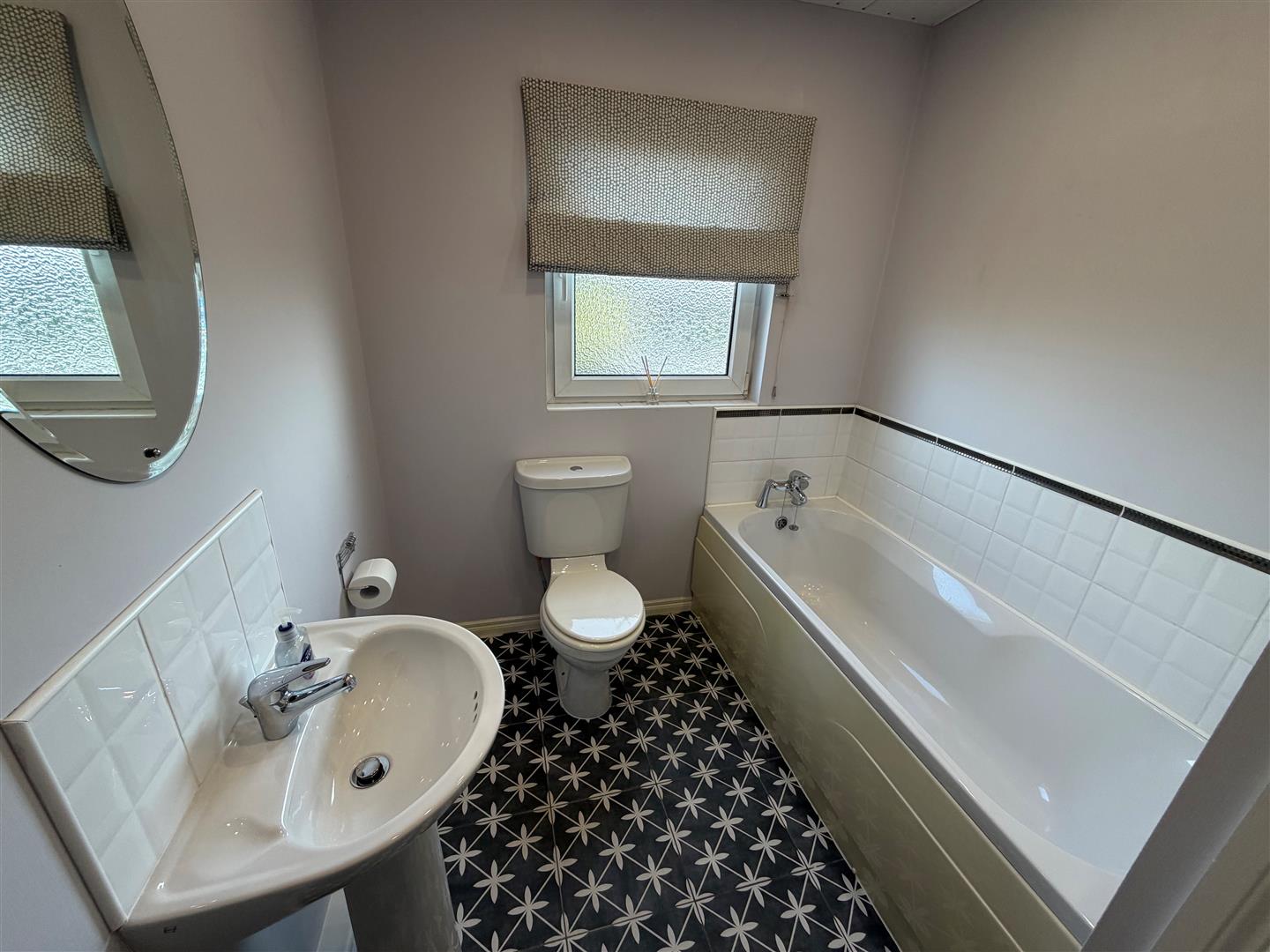 White suite comprising: Panelled bath with mixer taps. Pedestal wash hand basin with mixer taps. W.C. Part tiled walls. Ceramic tiled floor. PVC ceiling with 4 Downlights. built-in extractor fan. Built-in storage cupboard.