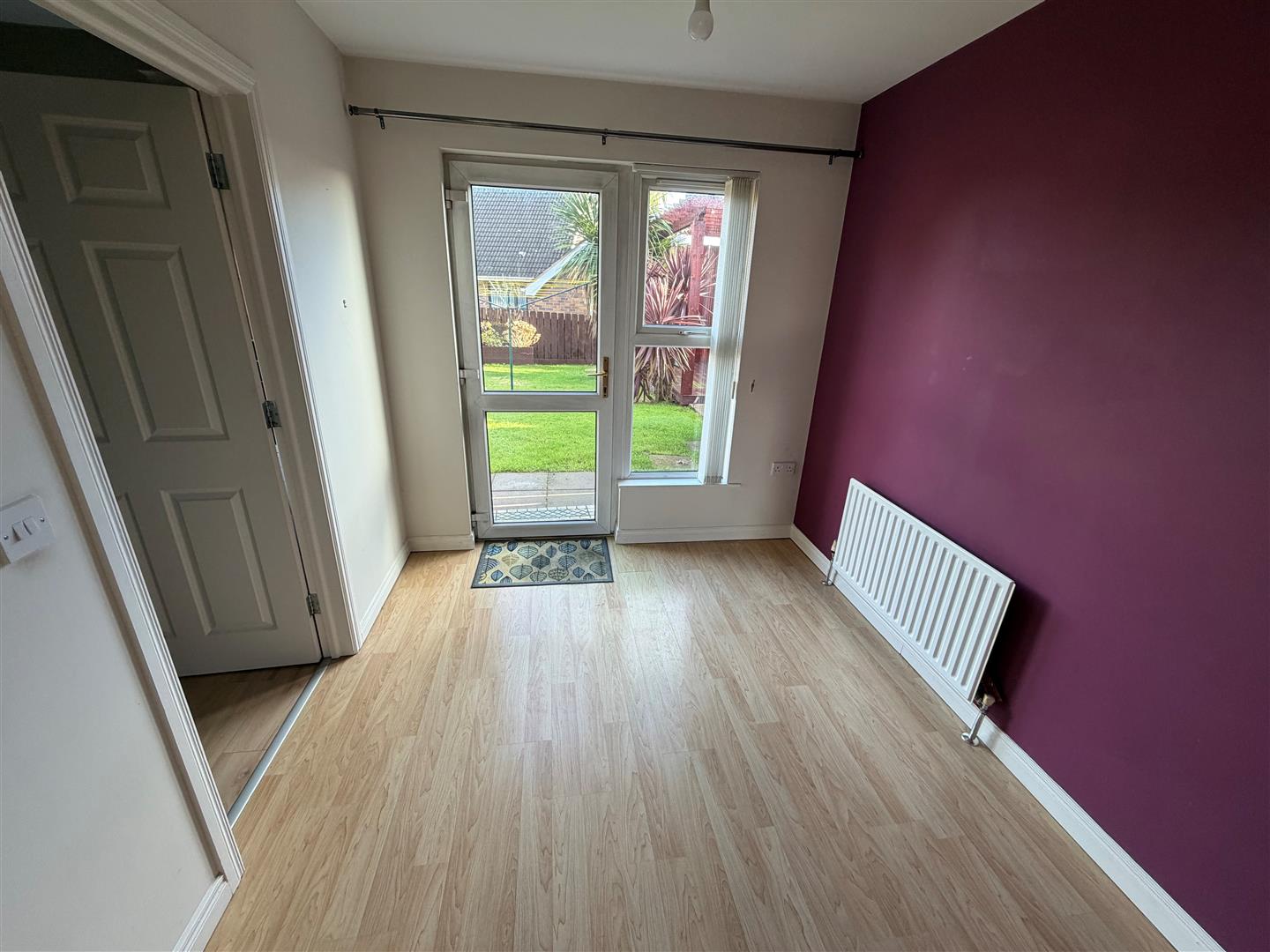 Mock fireplace with electric fire, tiled effect surround with maple mantel. Laminated wood floor.