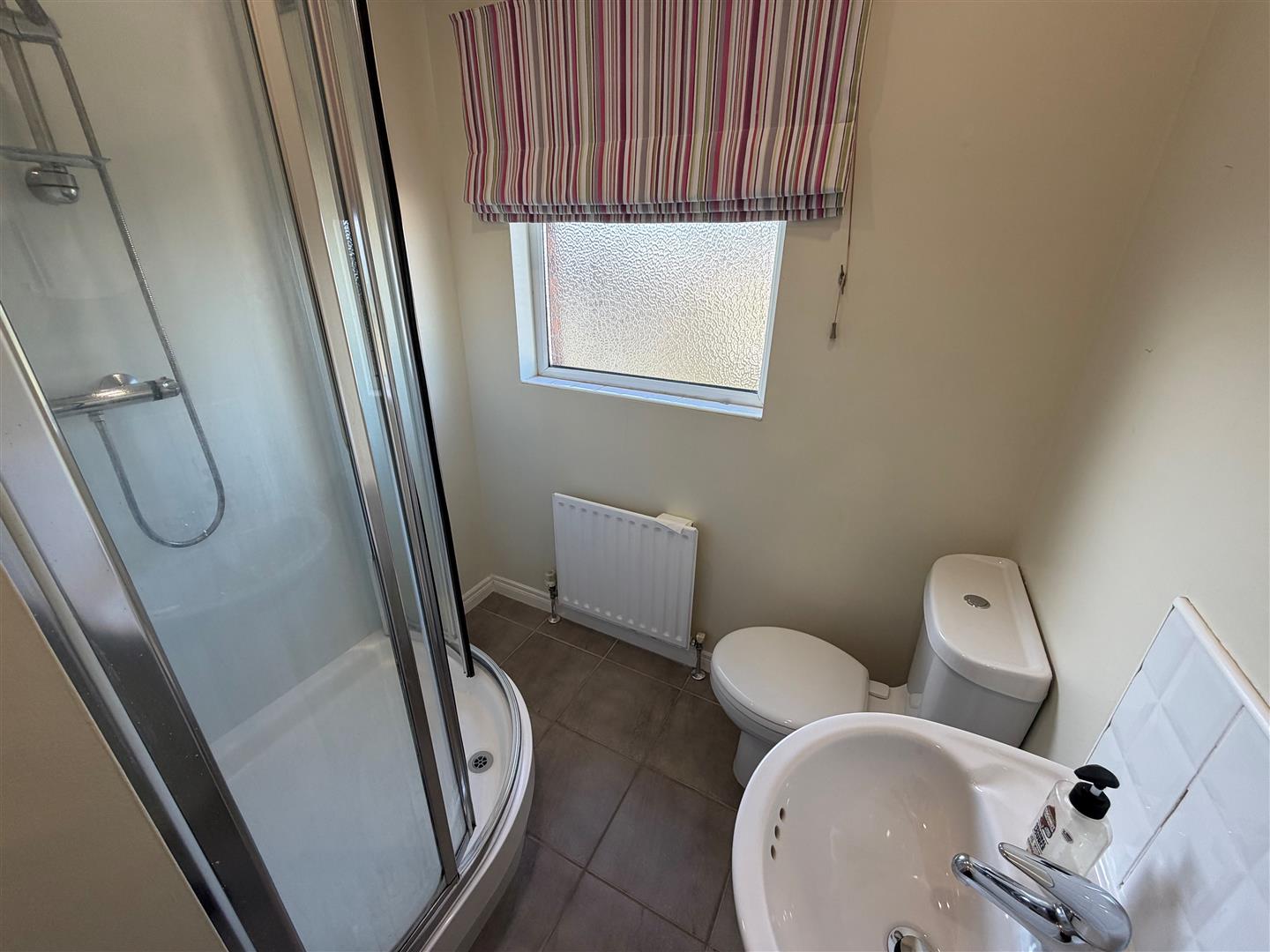 Comprising: Corner shower with thermostatic shower over. Pedestal wash hand basin with mixer taps and splash back. W.C. Ceramic tiled floor. PVC ceiling with 3 Downlights.
