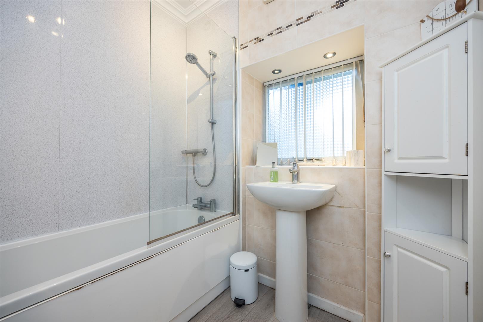 White suite comprising: Panelled bath with mixer tap and shower over. Shower Screen. Low flush W.C. Pedestal wash hand basin with mixer tap. Wall mounted heated towel rail. Extractor fan. Corniced ceiling. Part tiled walls. Part panelled walls around bath. Double glazed windows.