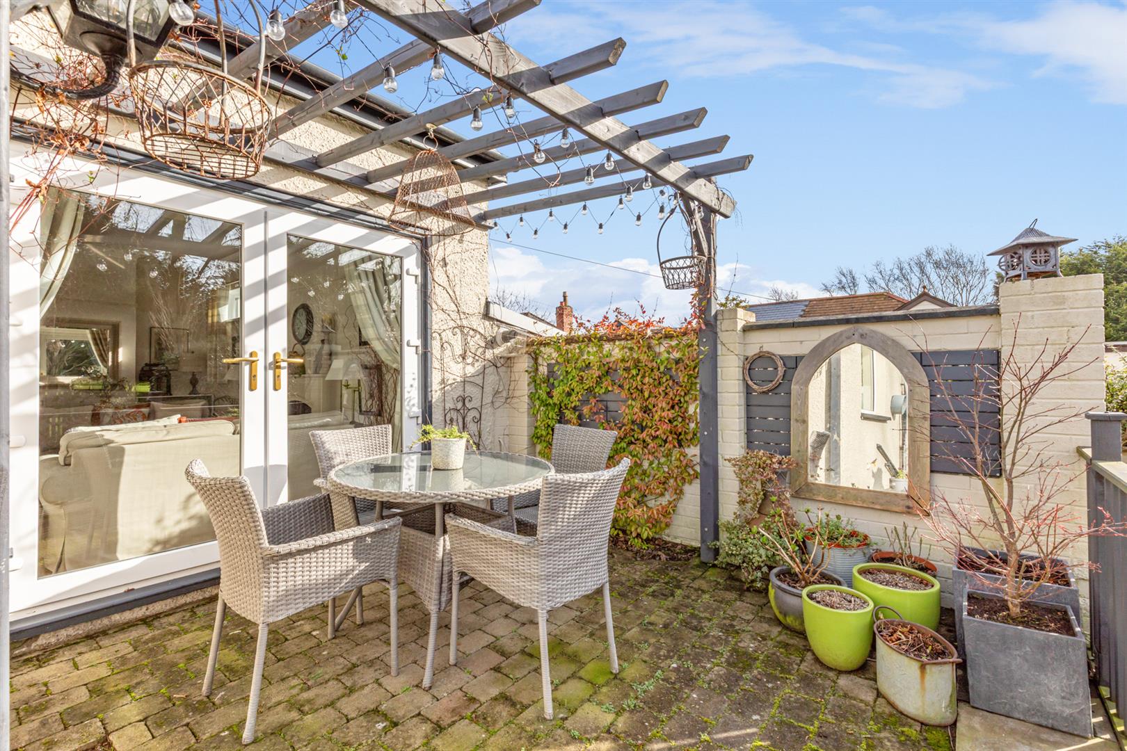 2 Tiered garden laid in lawn, host of plants and shrubs. Brick paved patio with pergola. Garden decking. Outside tap. Rear garden gate. Outlook to Bangor Golf Course