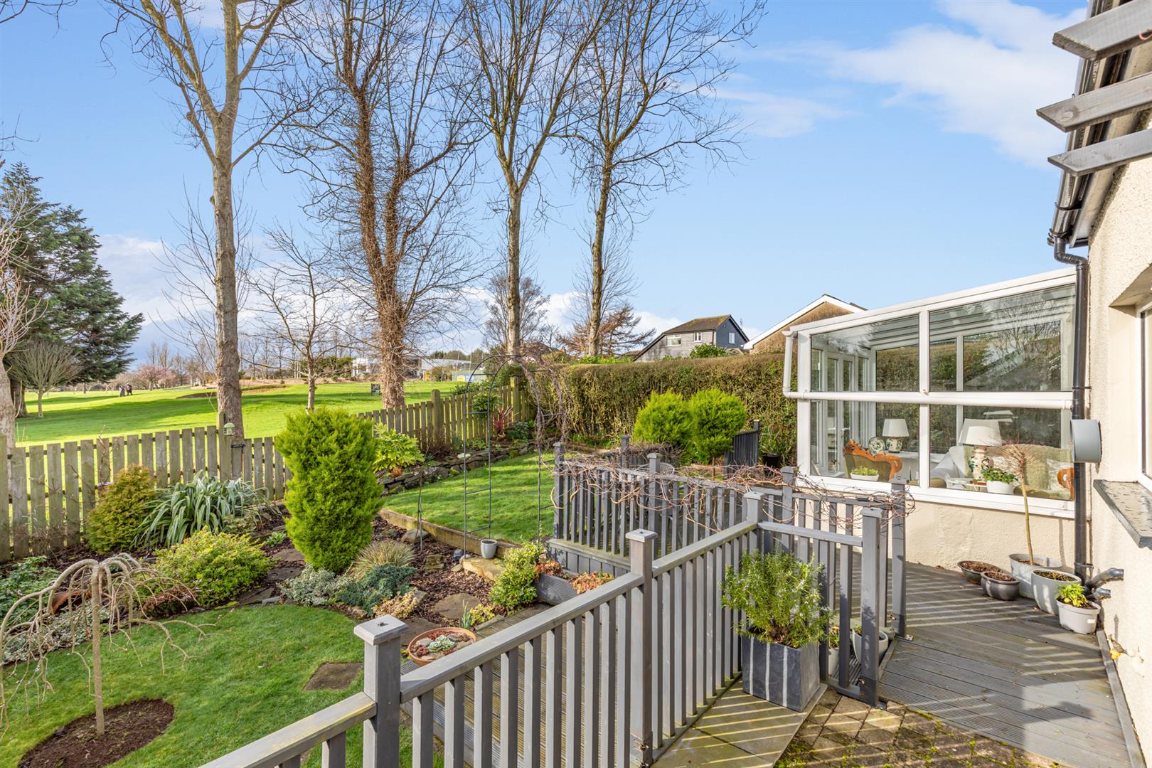 Outside the front garden is laid in stones to facilitate ease of management and there is a concrete drive which provides access to the attached garage. The enclosed and well tended rear garden enjoys a profusion of plants and shrubs, a paved patio and garden decking, an excellent vantage point to observe passing golfers!