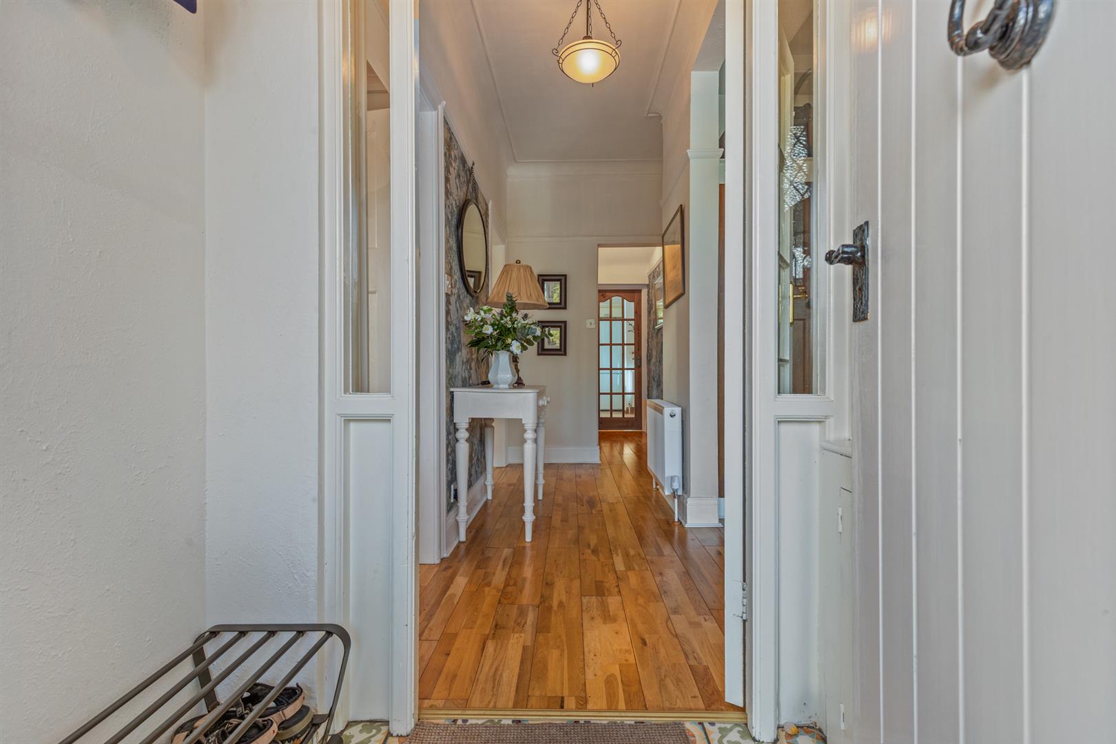Wooden flooring. Double panel radiator. Feature single glazed leaded double doors to cloak cupboards. Picture rail. Corniced ceiling. Access to roofspace. 2 Separate shelved cupboards in inner hallway (one plumbed for washing machine).