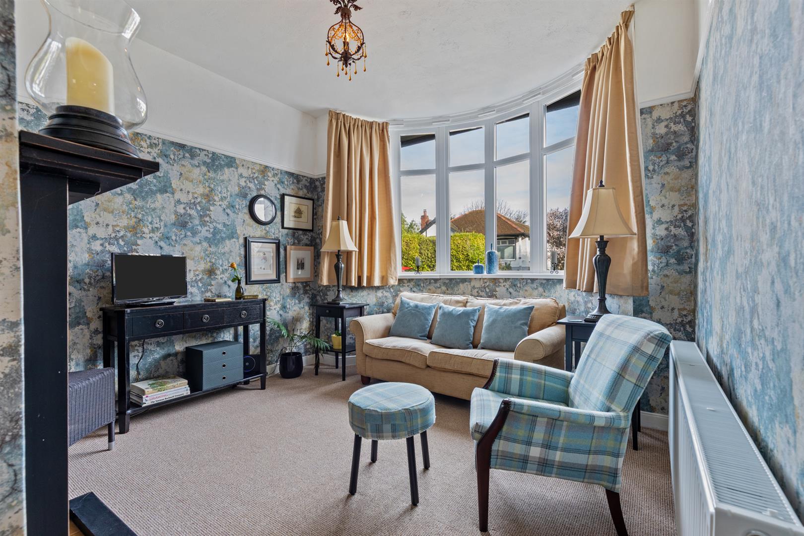 Open plan access from hallway. Fireplace with tiled inset and hearth. Feature bow window with uPVC double glazed windows. Picture rail. Double panel radiator.