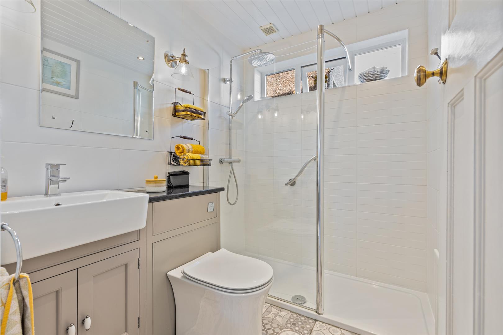 White suite comprising: Vanity unit with inset wash hand basin with mixer tap. Low flush W.C. Spacious walk-in shower cubicle. Tiled walls. Tiled floor. Panelled ceiling. 2 Wall light points. Ceiling downlighters. Extractor fan. uPVC double glazed windows.