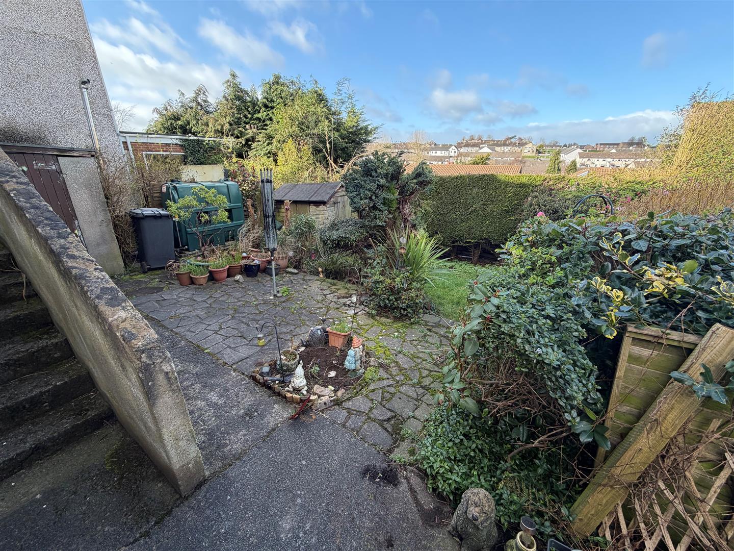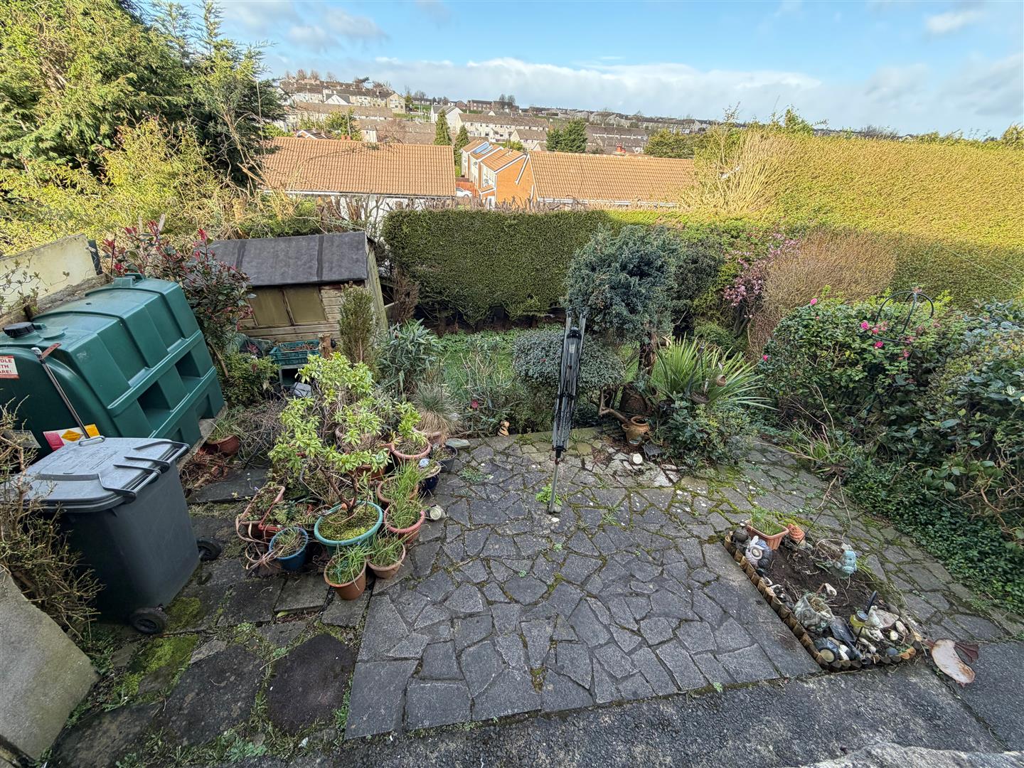 Enclosed garden in lawn with trees and shrubs. Boiler house. Coal House. PVC oil tank. Tap. Sensor light.