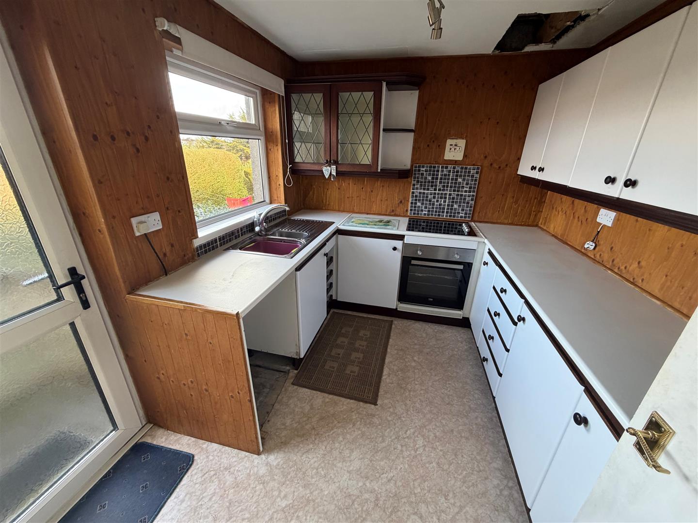 Range of high and low level cupboards and drawers with roll edge work surfaces. Built-in 4 ring hob and Beko oven under. 11/2 tub single drainer stainless steel sink unit with mixer taps. Plumbed for washing machine.