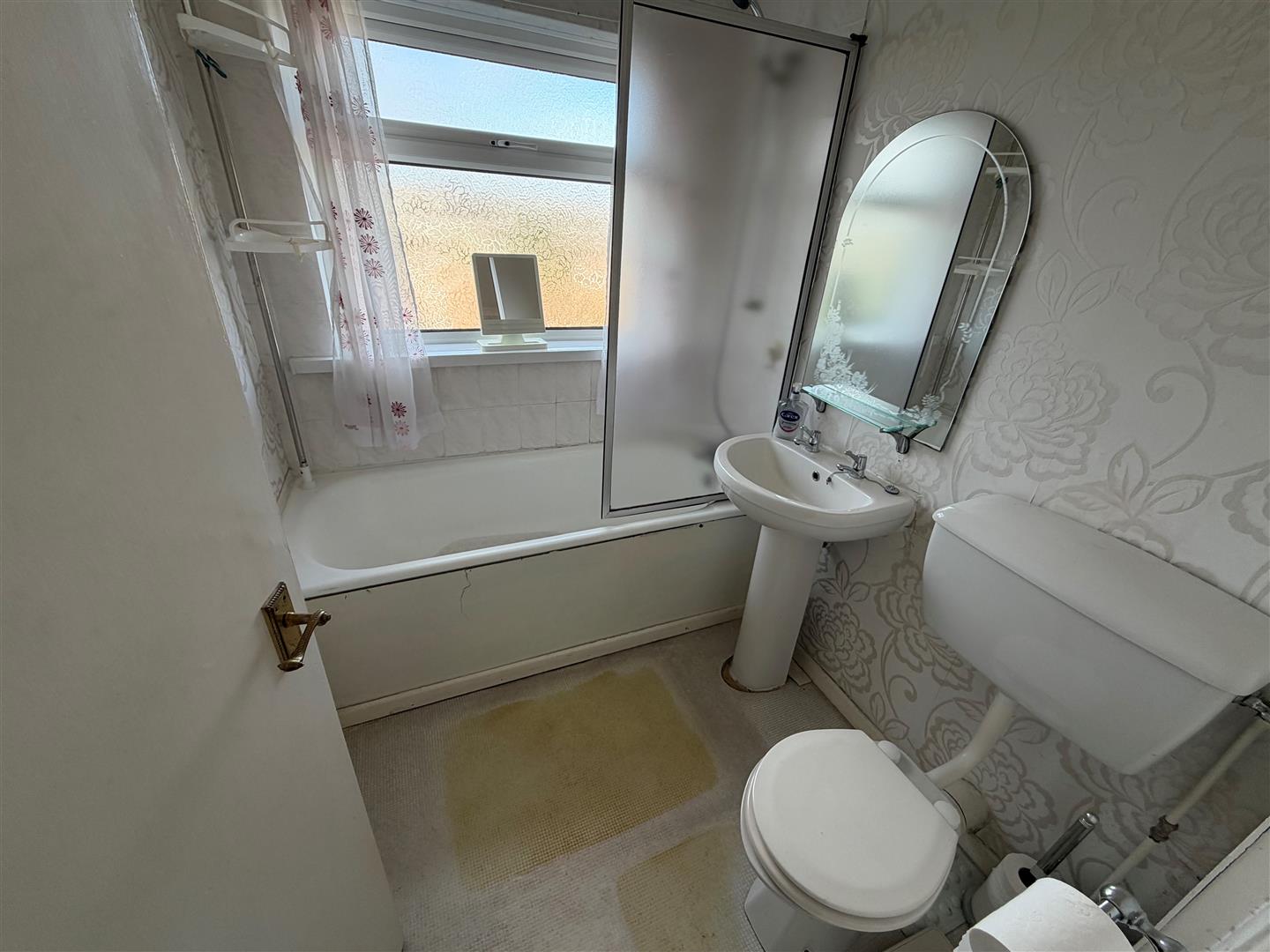 White suite comprising: Panelled bath with mixer tap and telephone shower attachment. Pedestal wash hand basin. W.C. Part tiled walls.