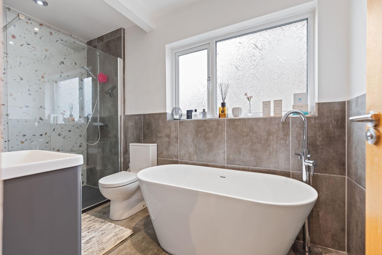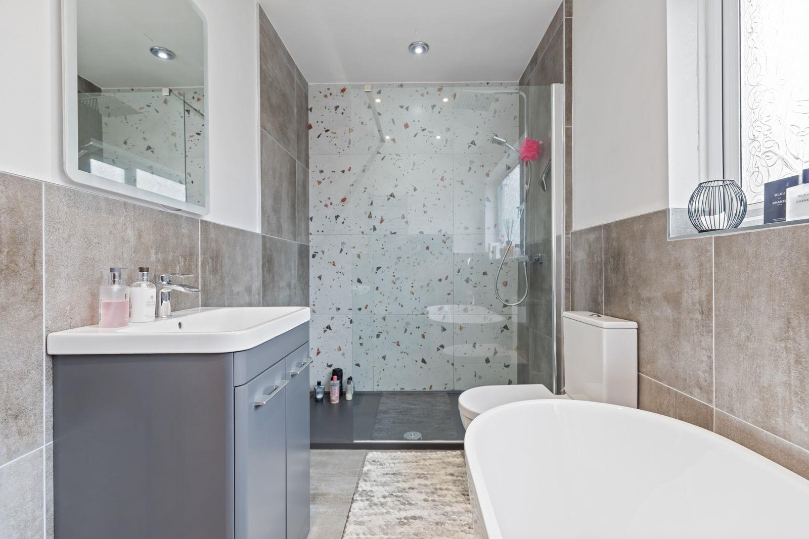Comprising: Walk-in shower with thermostatic shower and drencher. Free standing bath with mixer tap. Vanity unit with inset wash hand basin and mixer tap. W.C. Part tiled walls. Ceramic tiled floor. 5 Downlights. Built-in extractor fan.