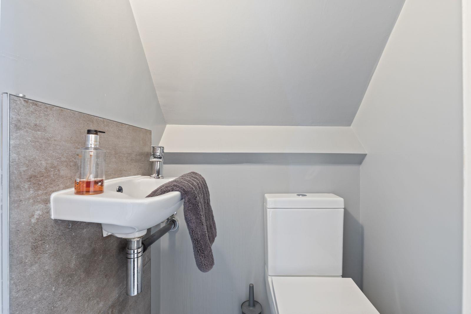 Comprising: Wash hand basin with mixer tap and splash back. W.C. Ceramic tiled floor. Built-in storage cupboard.
