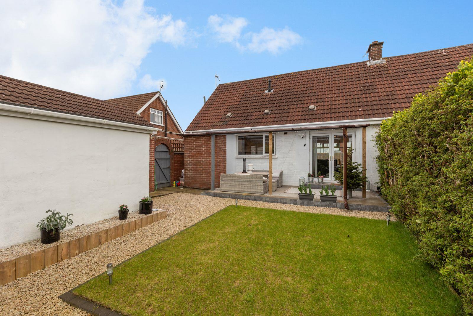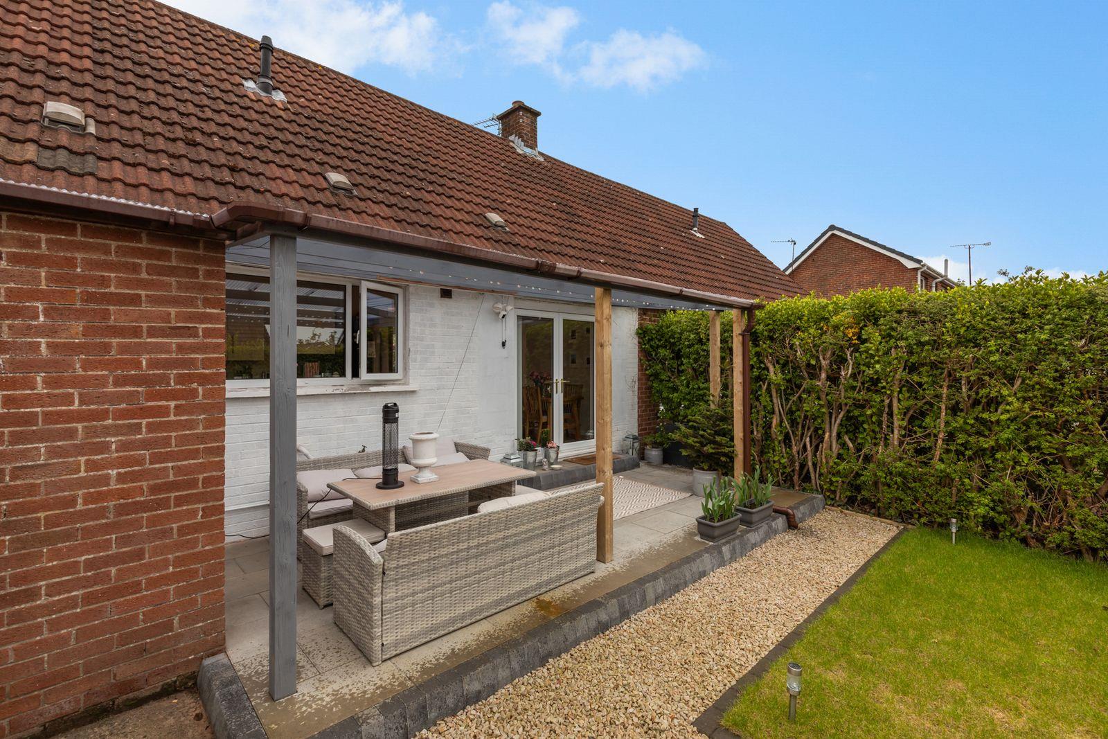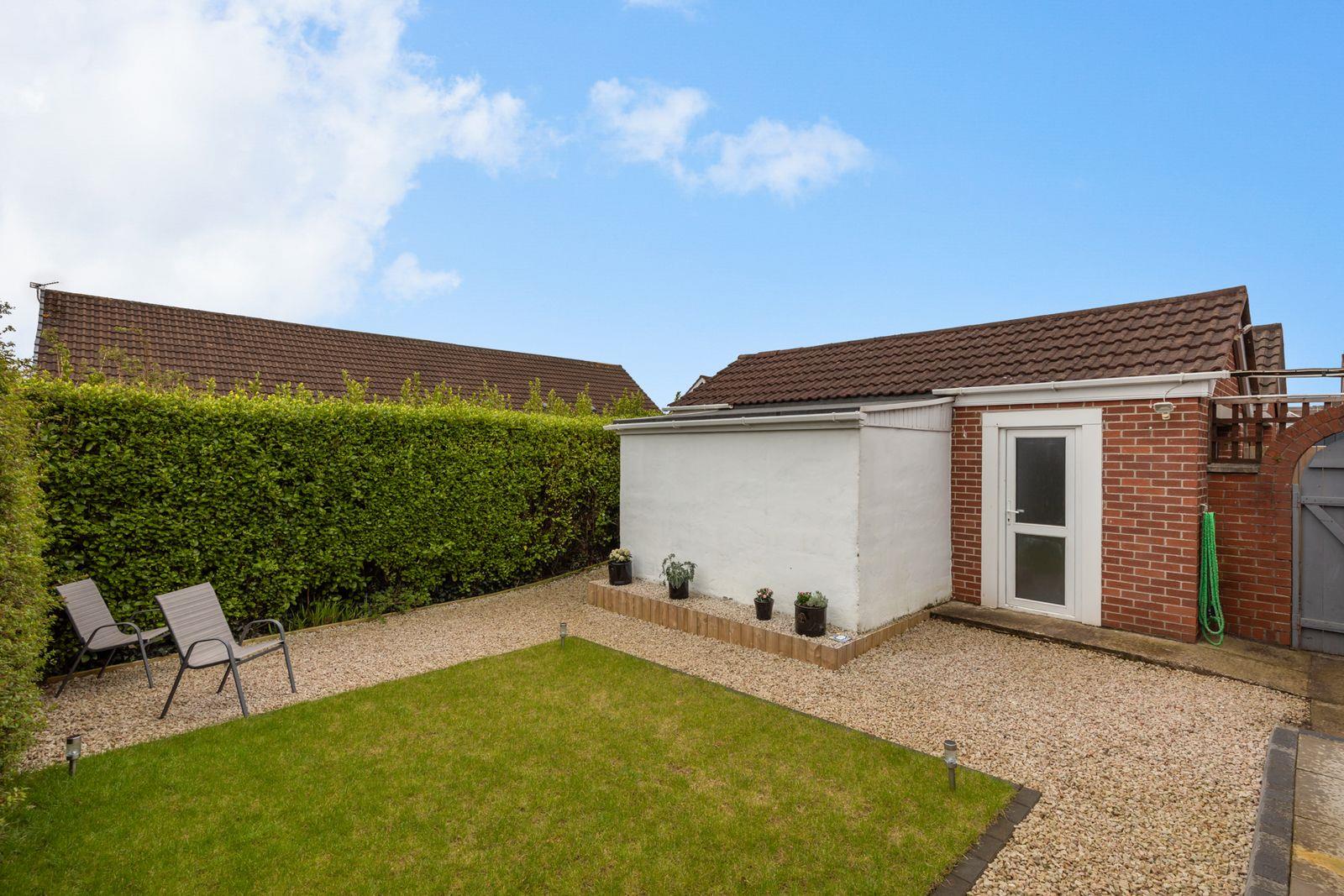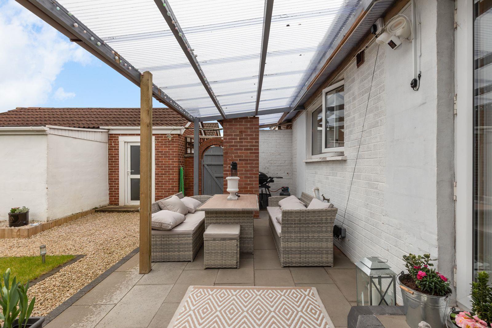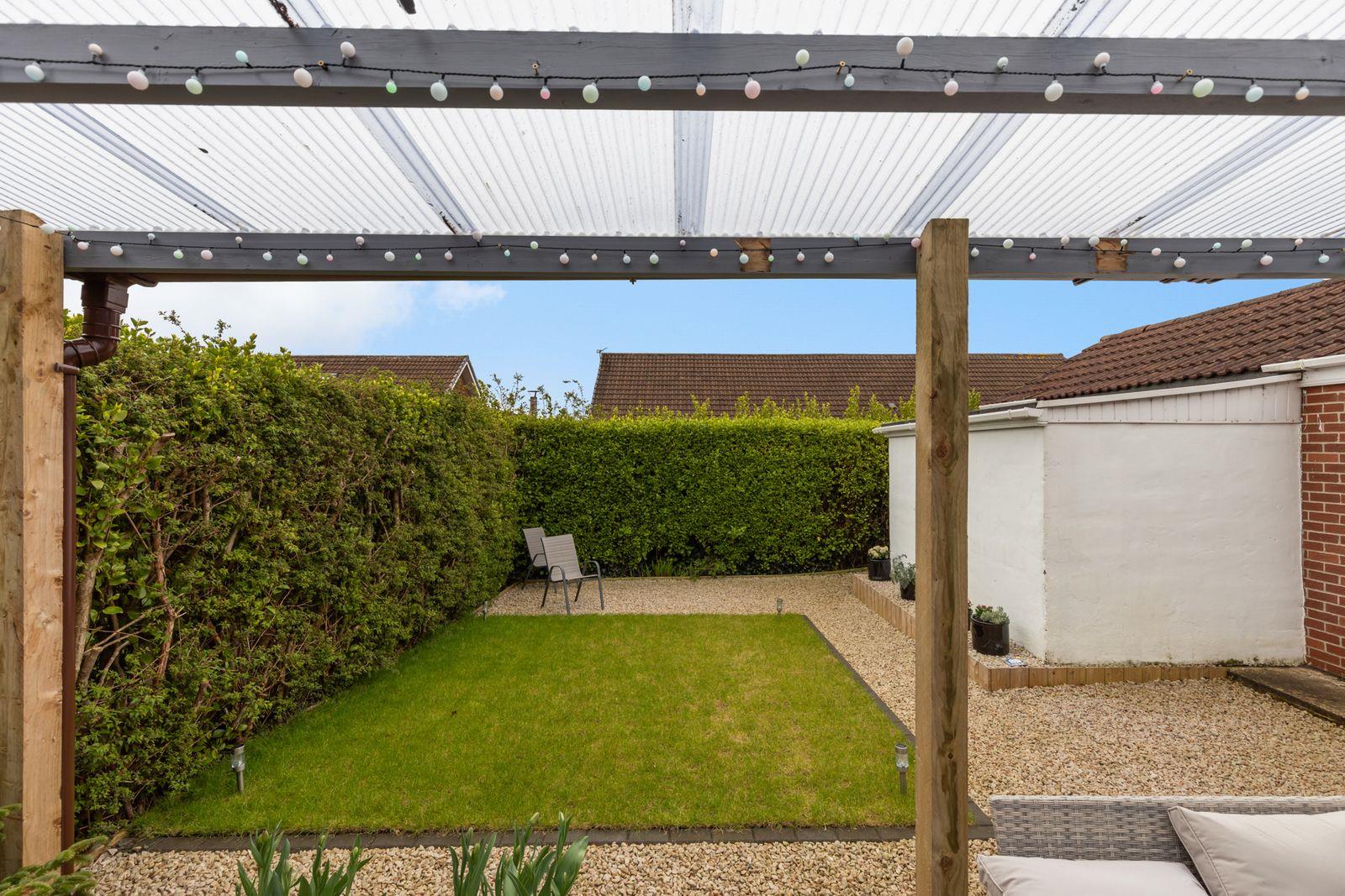 Enclosed rear garden in lawn with hedges. Covered decked patio. Paved patio. Outside power. Tap. Light.