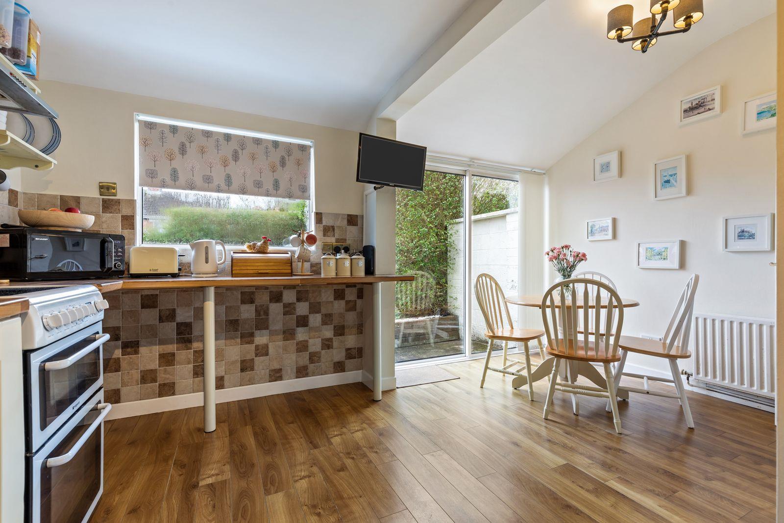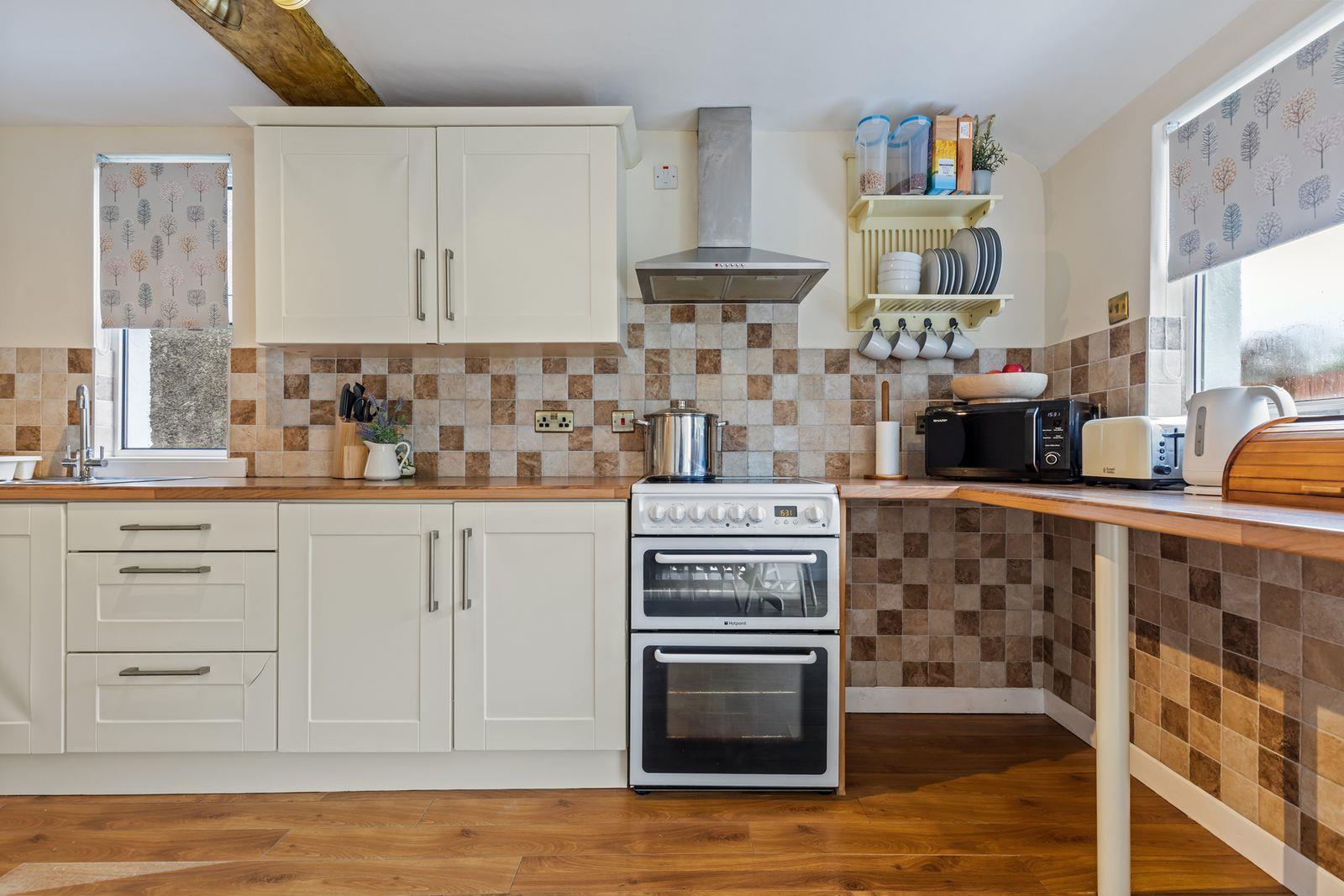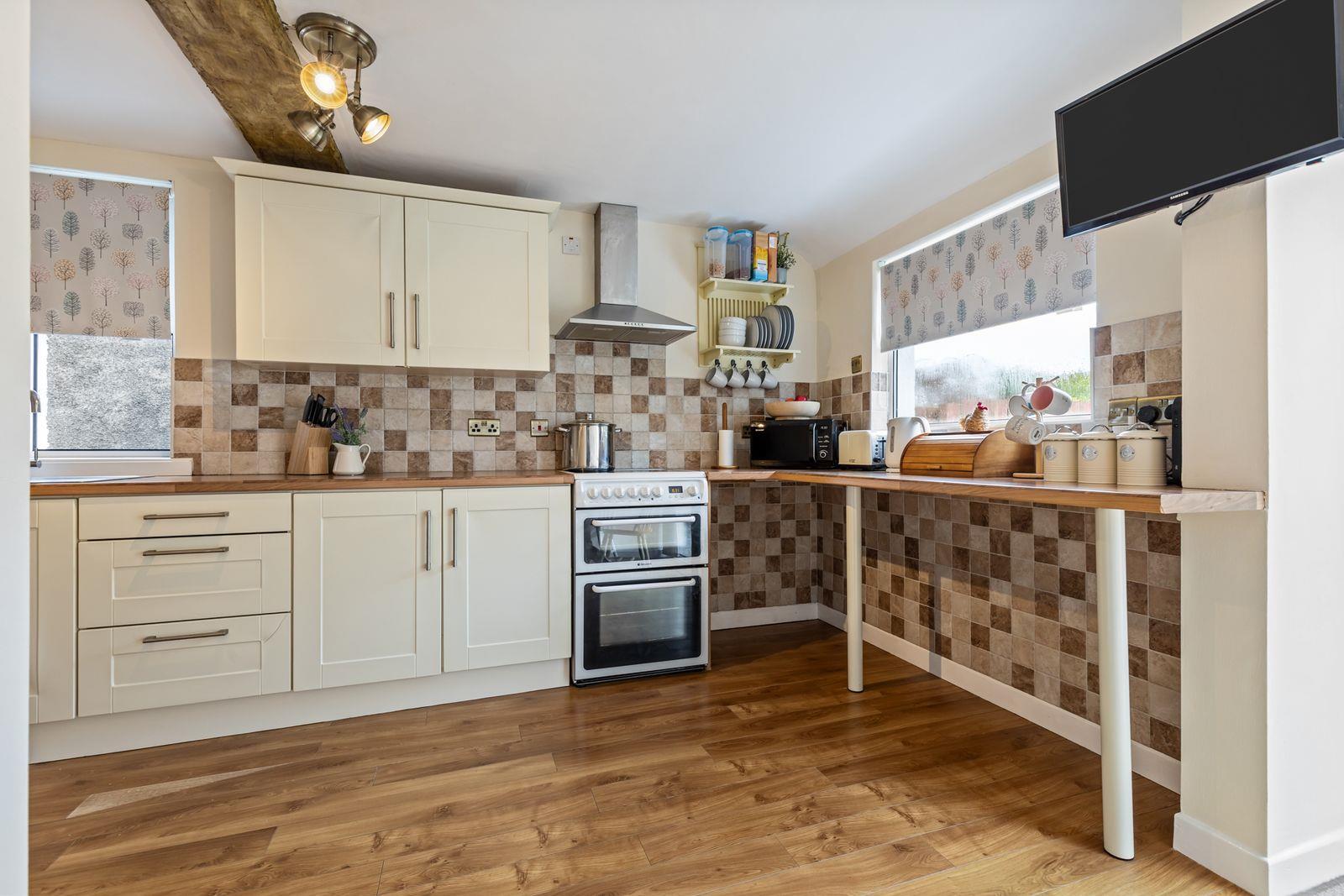 Cream range of high and low level cupboards and drawers with roll edge work surfaces. 11/2 stainless steel sink unit with mixer taps. Stainless steel extractor canopy. Plumbed for washing machine. uPVC patio door to rear. Laminated wood floor.