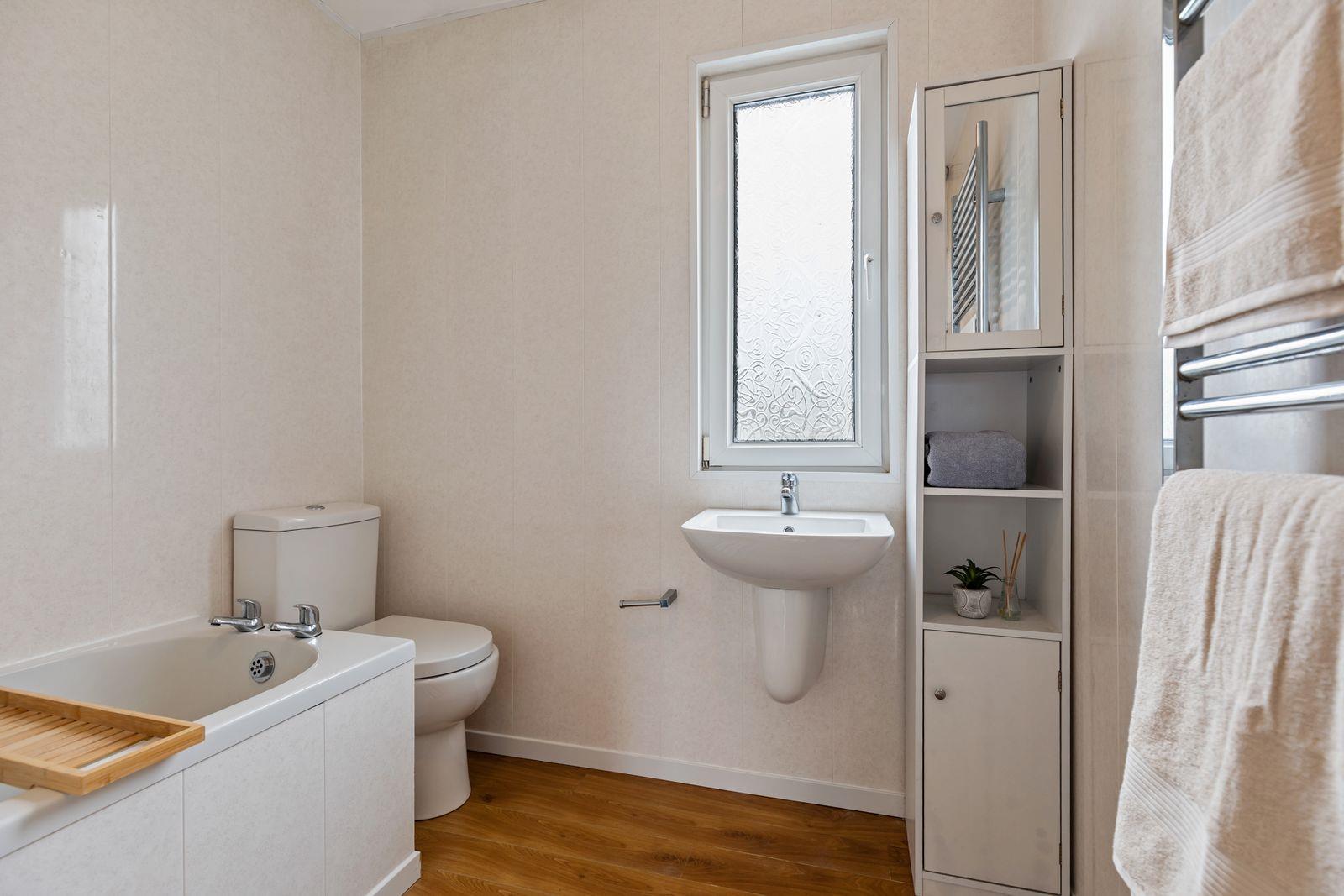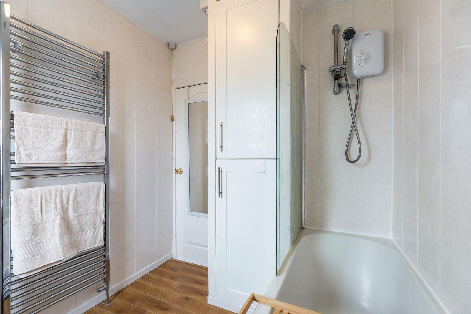 White suite comprising: Panelled bath with Redring electric shower. Wash hand basin with mixer tap. W.C. Chrome heated towel rail. Built-in extractor fan. Built-in storage cupboard with gas boiler. Laminated wood floor. Built-in extractor fan.
