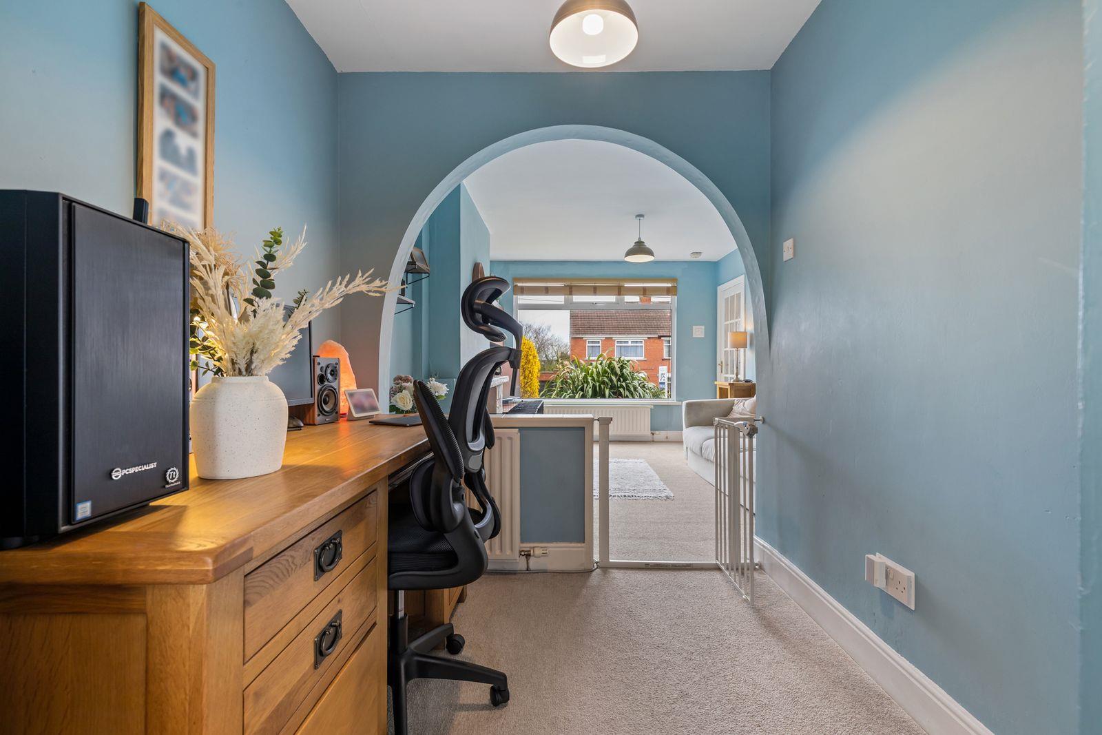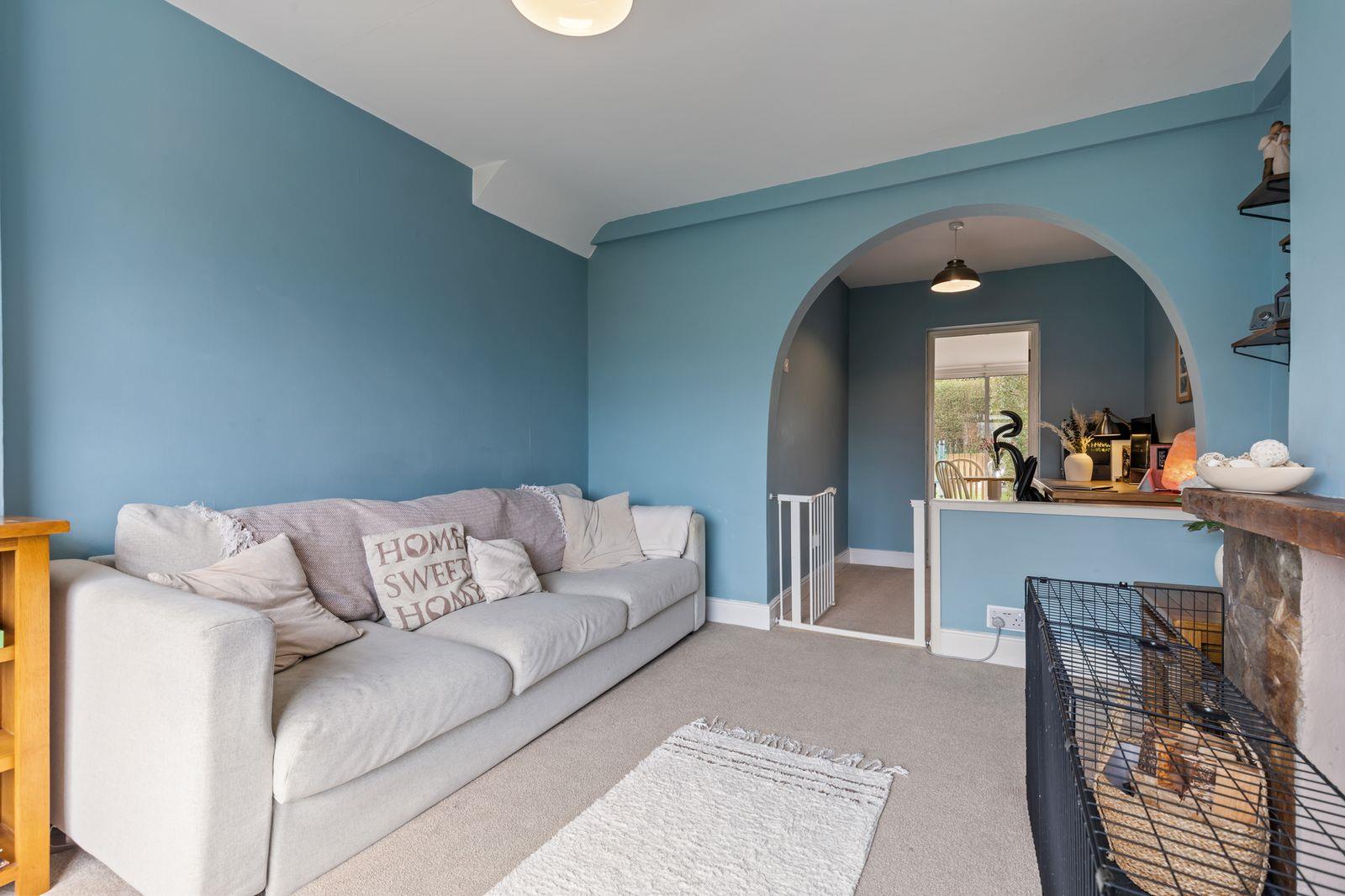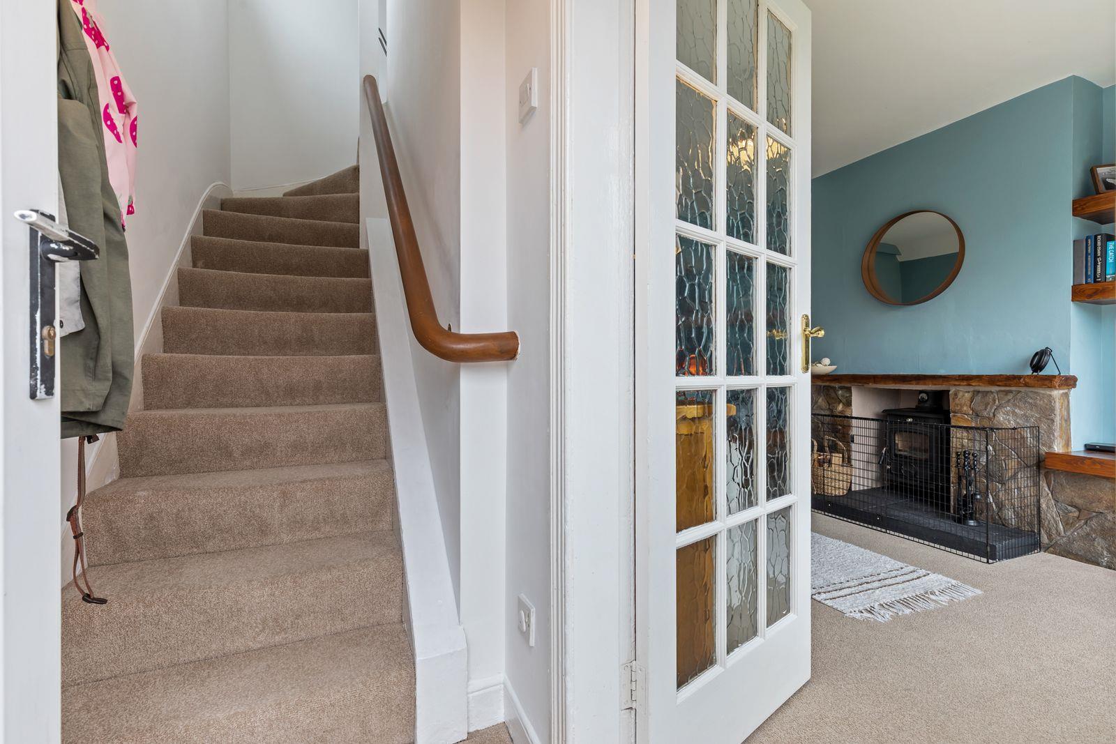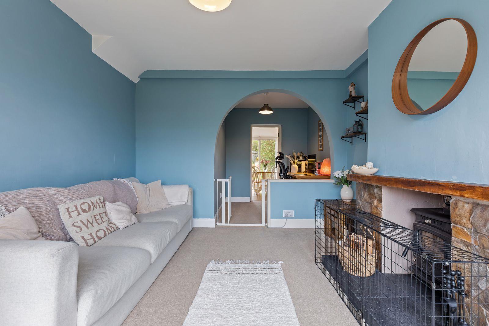 Open fireplace with wood burning stove. Stone surround and slate hearth. Archway to ...