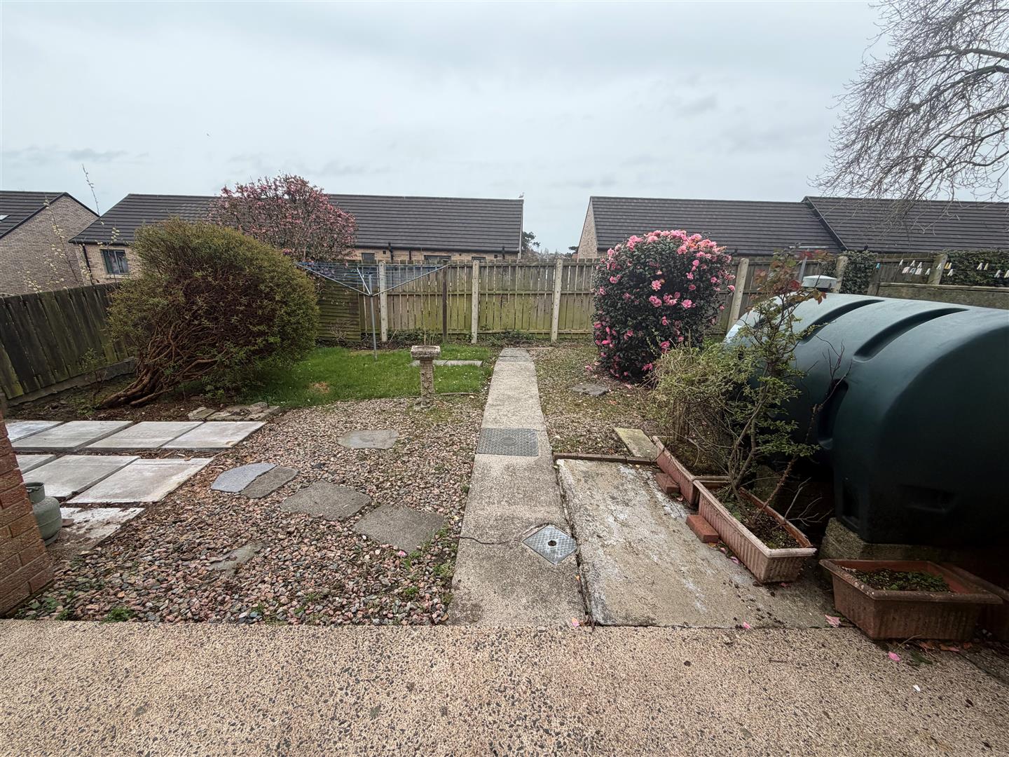 Enclosed garden in lawn. Boiler house. PVC oil tank. Tap. Light.