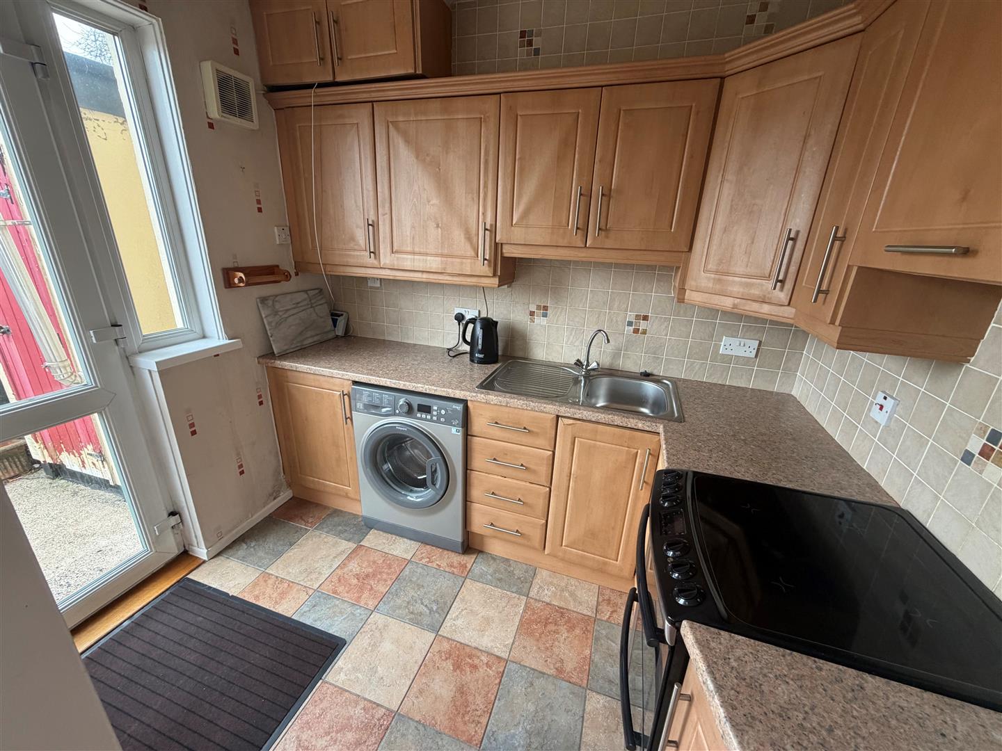 Range of high and low level cupboards and drawers with roll edge work surfaces. Single drainer stainless steel sink unit with mixer taps. Plumbed for washing machine. Part tiled walls. Ceramic tiled floor.