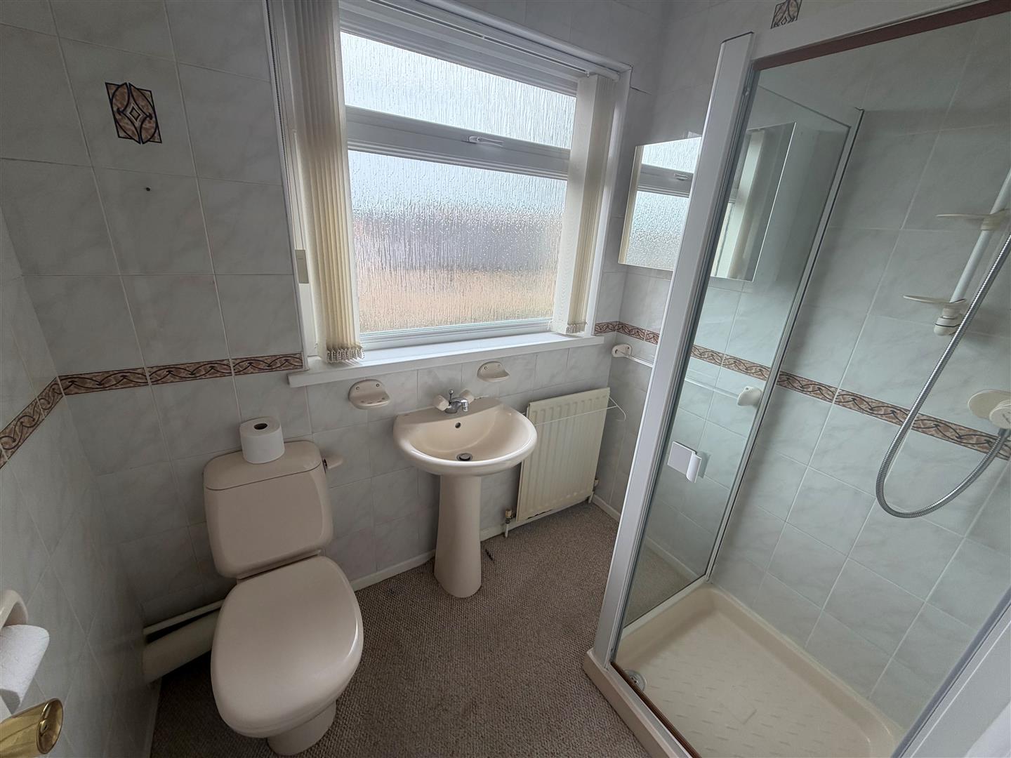 Comprising: Corner shower with New Team shower. Pedestal wash hand basin. W.C. Tiled walls.