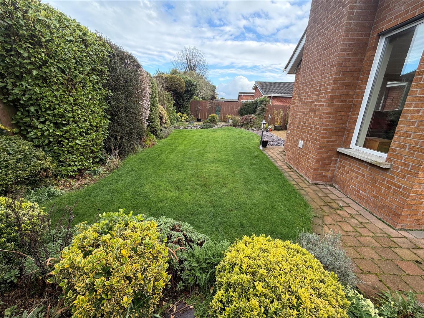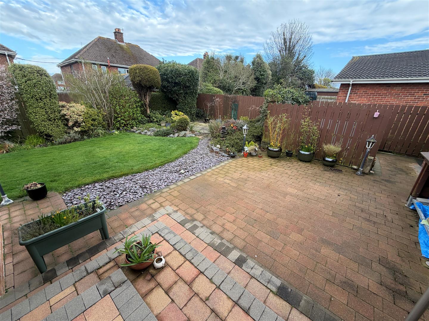 Enclosed garden in lawn with trees and shrubs. Paved patio. 2 Outhouses. Lights. Outside power.