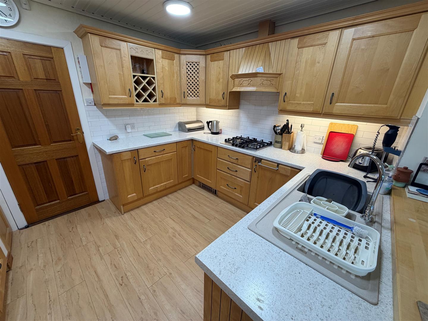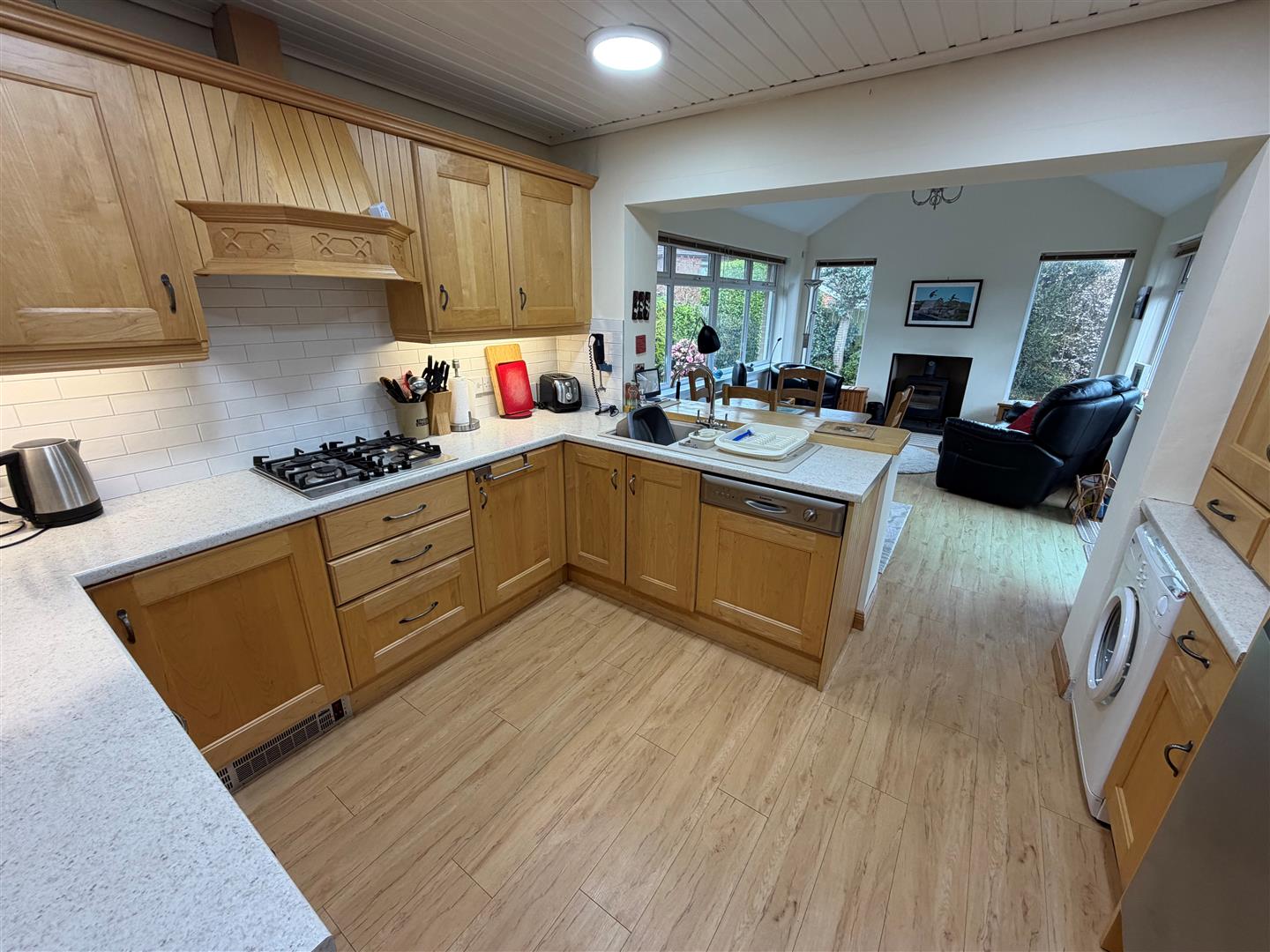 Range of maple high and low level cupboards and drawers with roll edge work surfaces. Built-in Neff gas 4 ring hob and oven. Extractor hood with integrated fan and light. Ariston integrated dishwasher. Plumbed for washing machine. Part tiled walls. Laminated wood floor. Pine ceiling with 4 downlights.