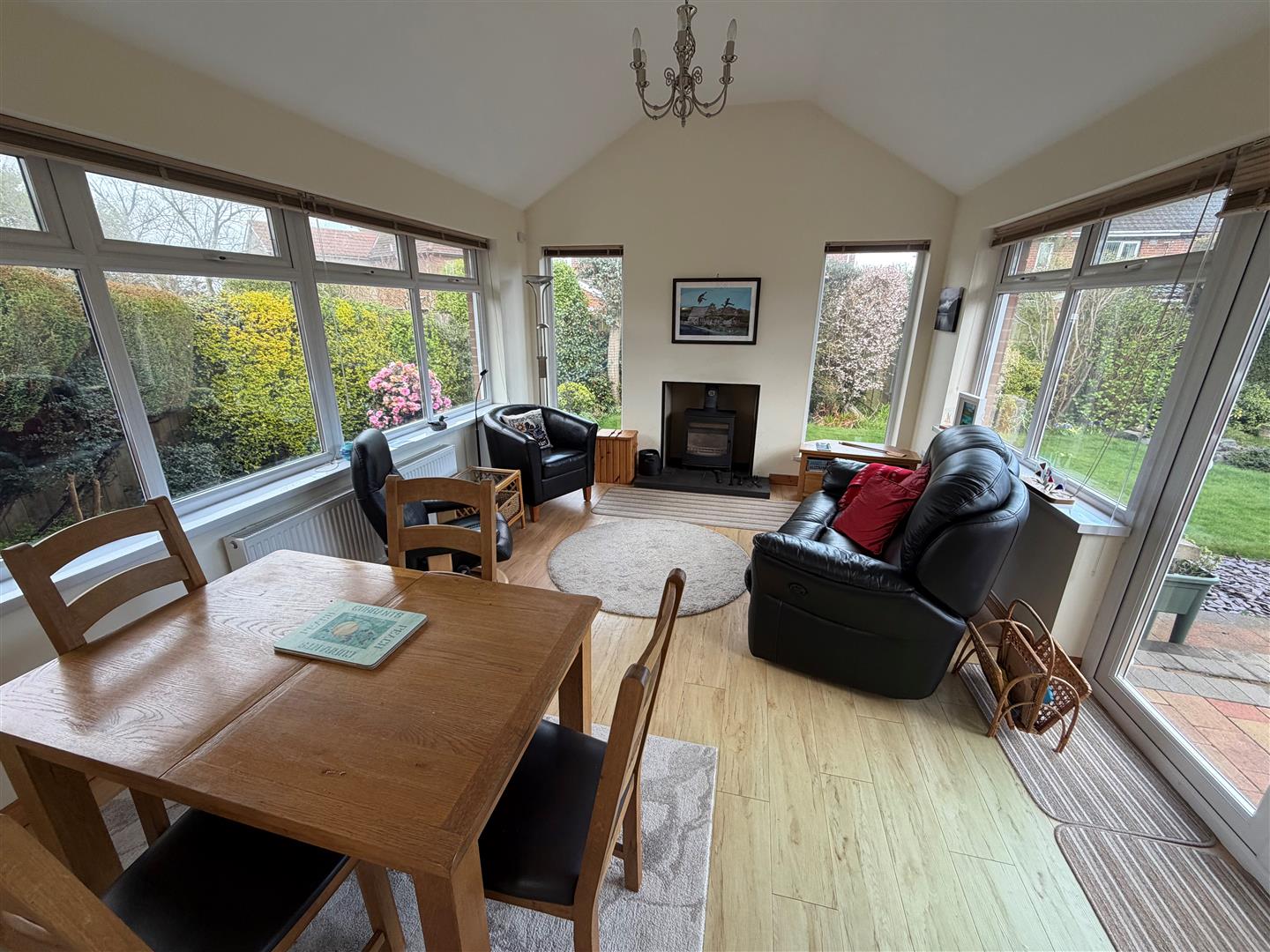 Wood burning stove with slate hearth. Laminated wood floor. uPVC double glazed French doors leading to rear.