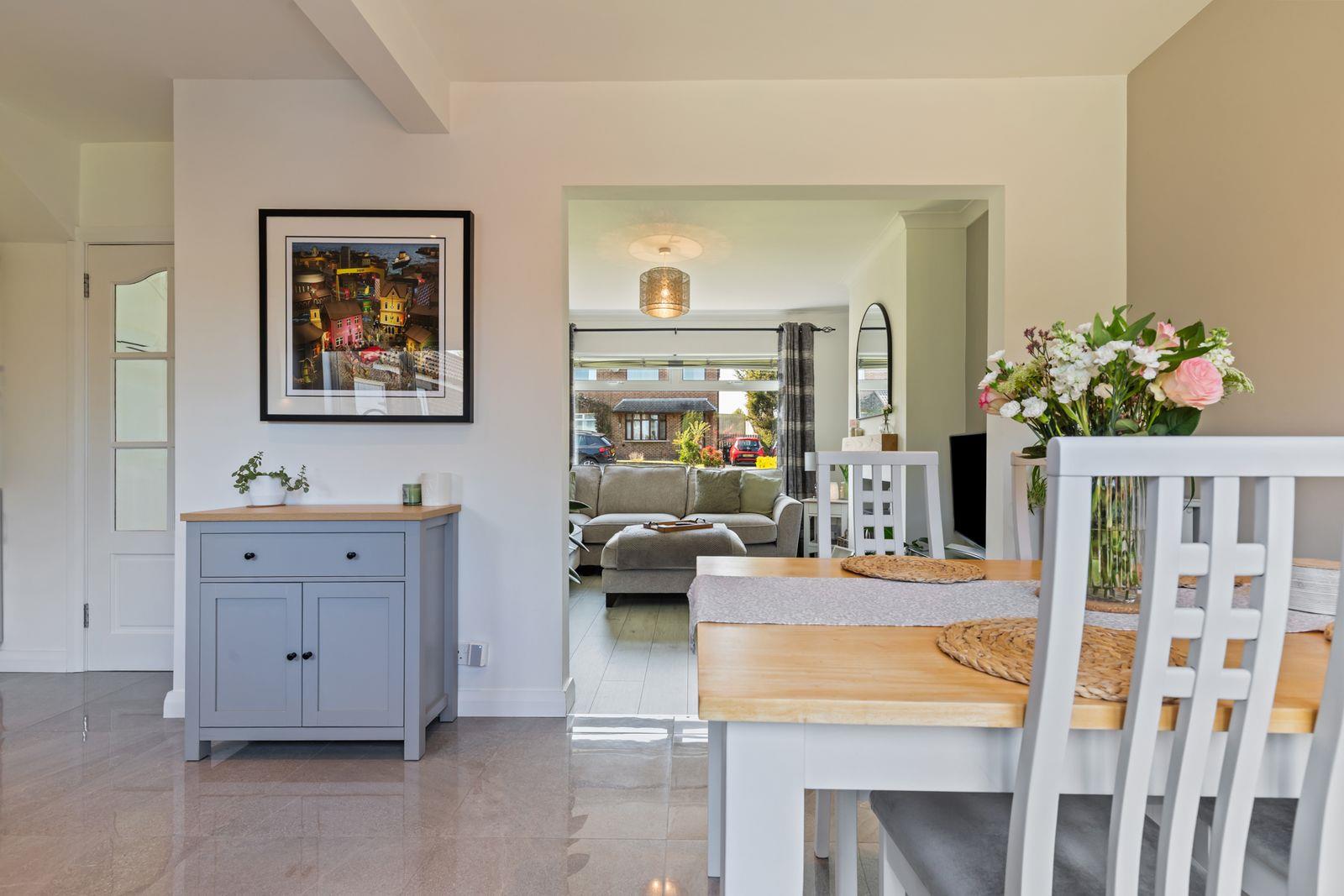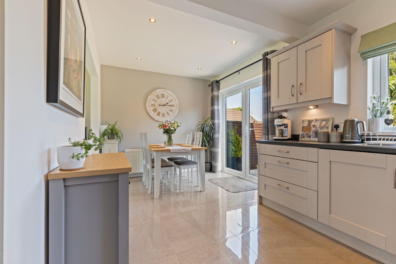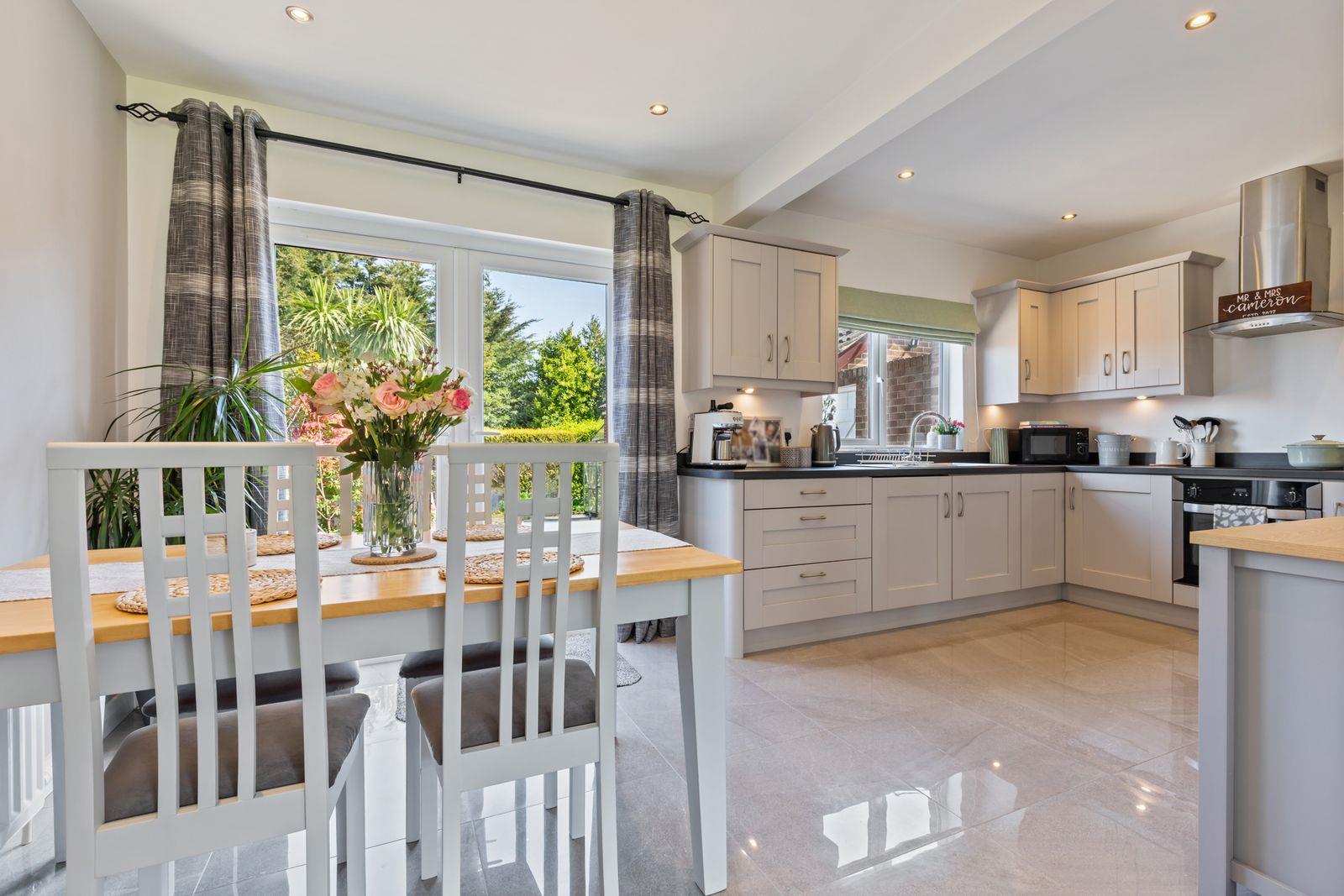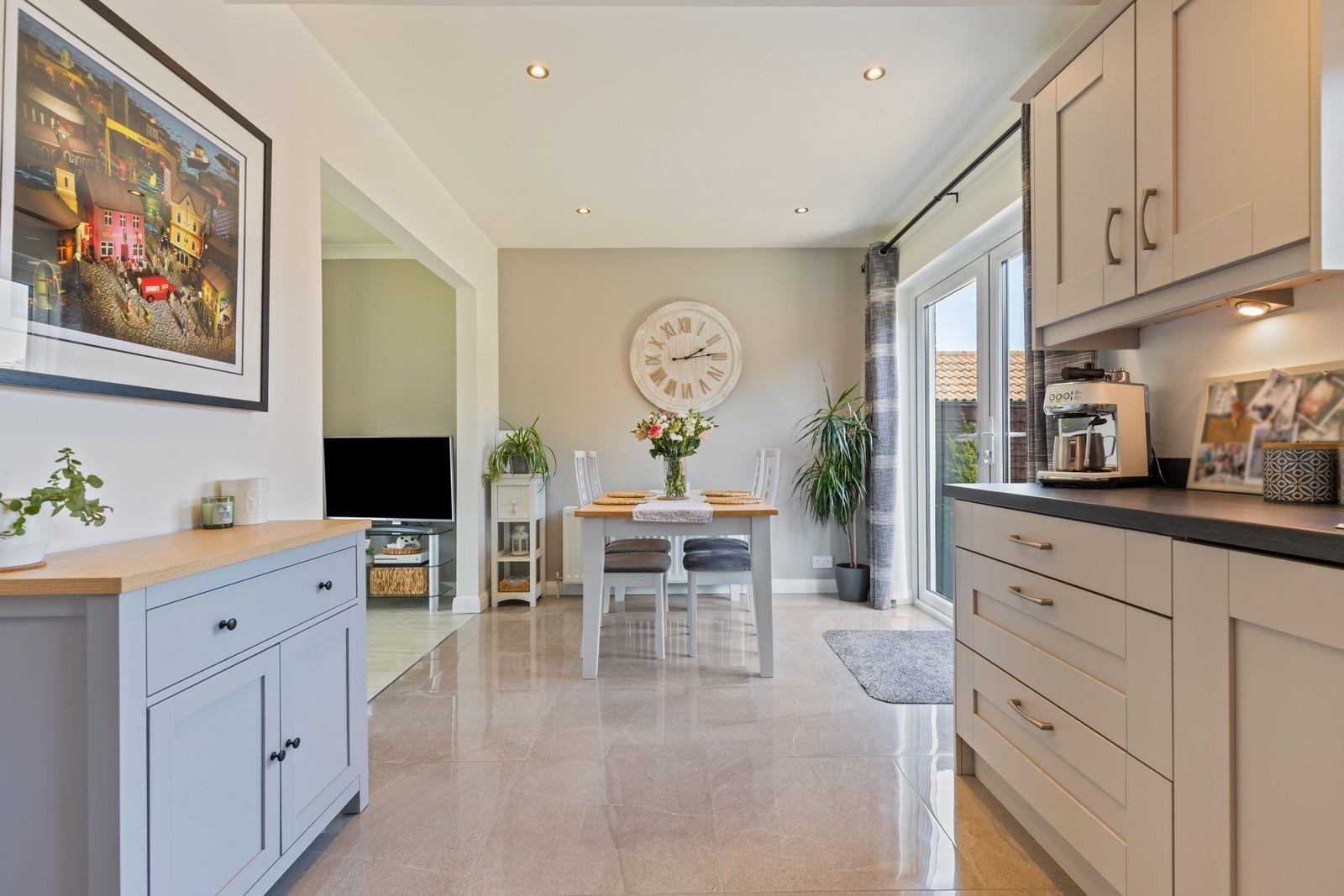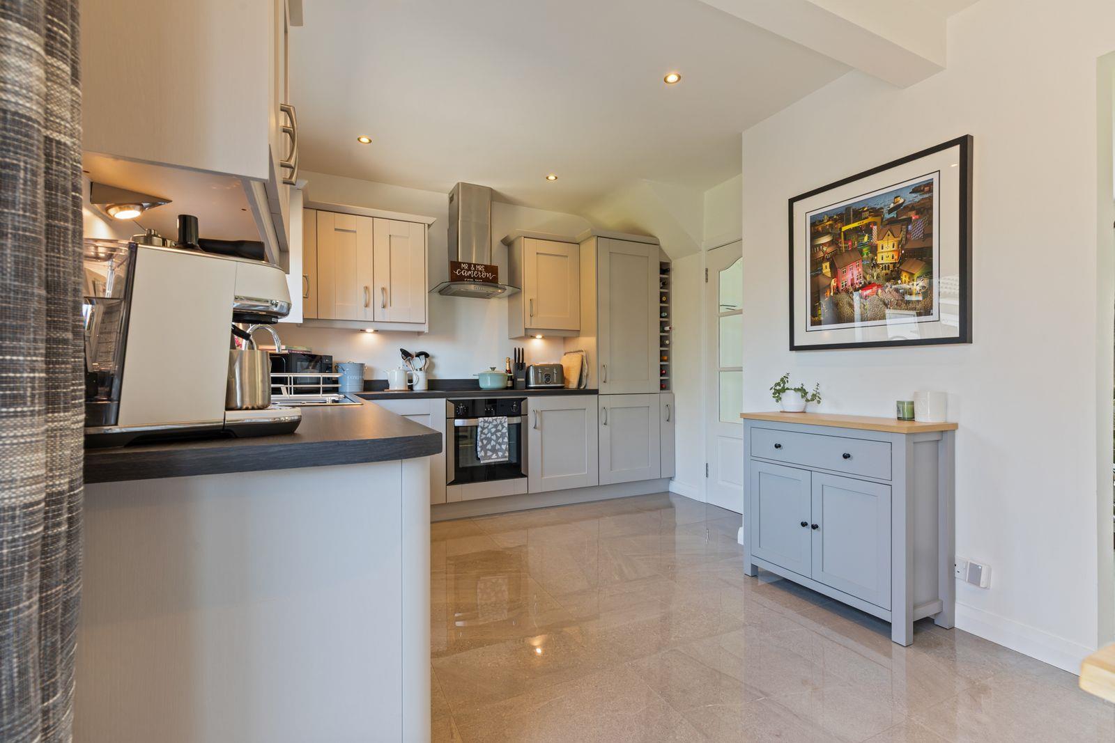 The ground floor boasts a bright and inviting lounge, enhanced by an attractive multi-fuel stove-perfect for cosy evenings. To the rear, a contemporary cashmere kitchen flows seamlessly into an open plan dining area, creating an ideal space for both everyday living and entertaining.