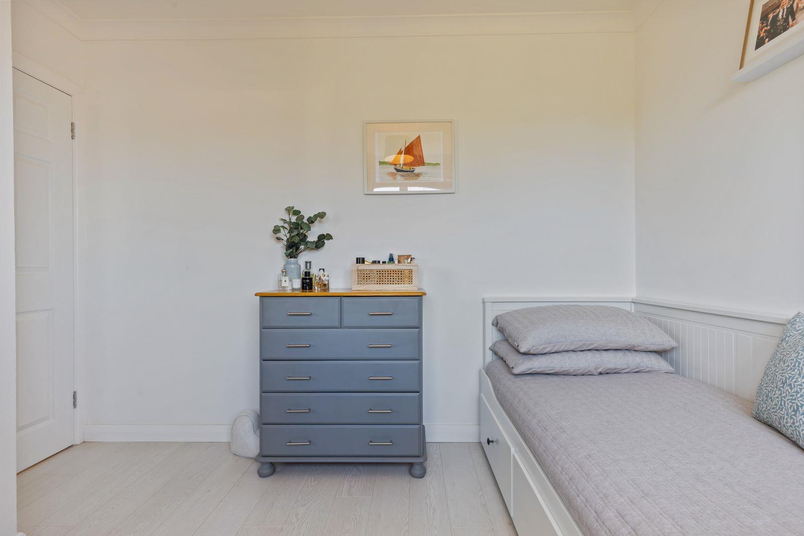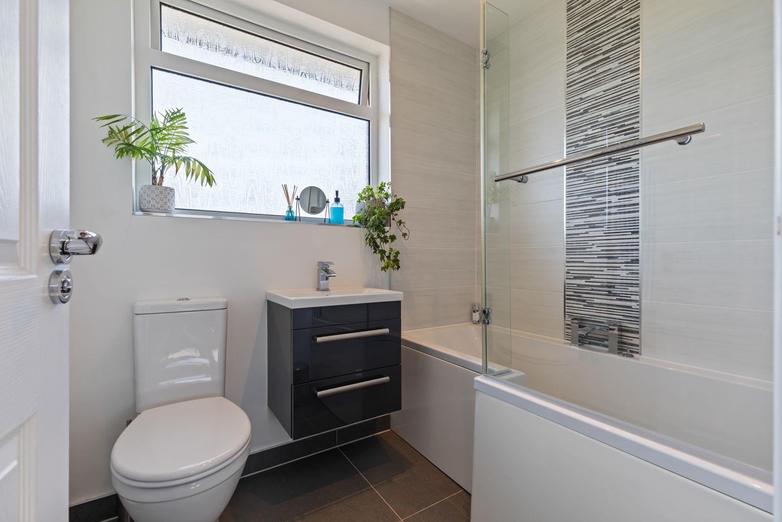 Upstairs, the property offers three well-proportioned bedrooms along with a modern bathroom, fitted with a sleek white suite, complete with both a shower and drencher for a touch of luxury.