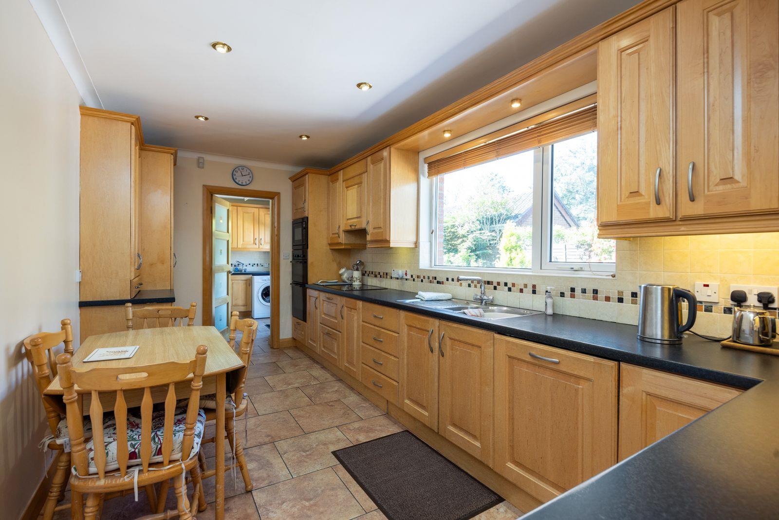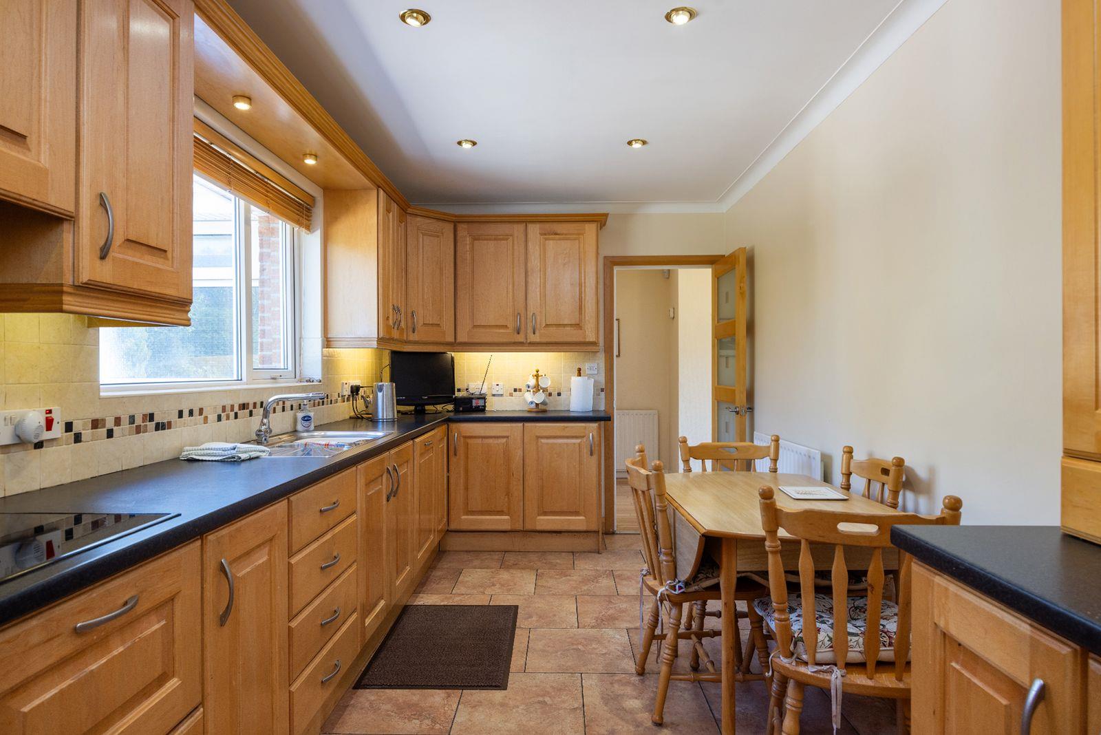 High and low level units, roll edge work surfaces. Stainless steel sink unit with mixer taps. Plumbed for washing machine. Single panel radiator. Tiled floor. Part tiled walls. White uPVC double glazed windows and rear door. Door to integral garage.
