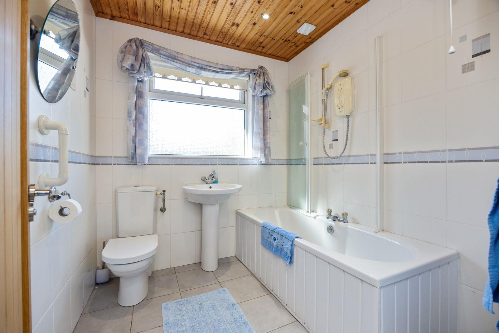 Mira electric shower. Low flush W.C. Pedestal wash hand basin with mixer tap. Single panel radiator. White uPVC double glazed windows. Tiled floor. Panelled ceiling. Ceiling Downlighters.