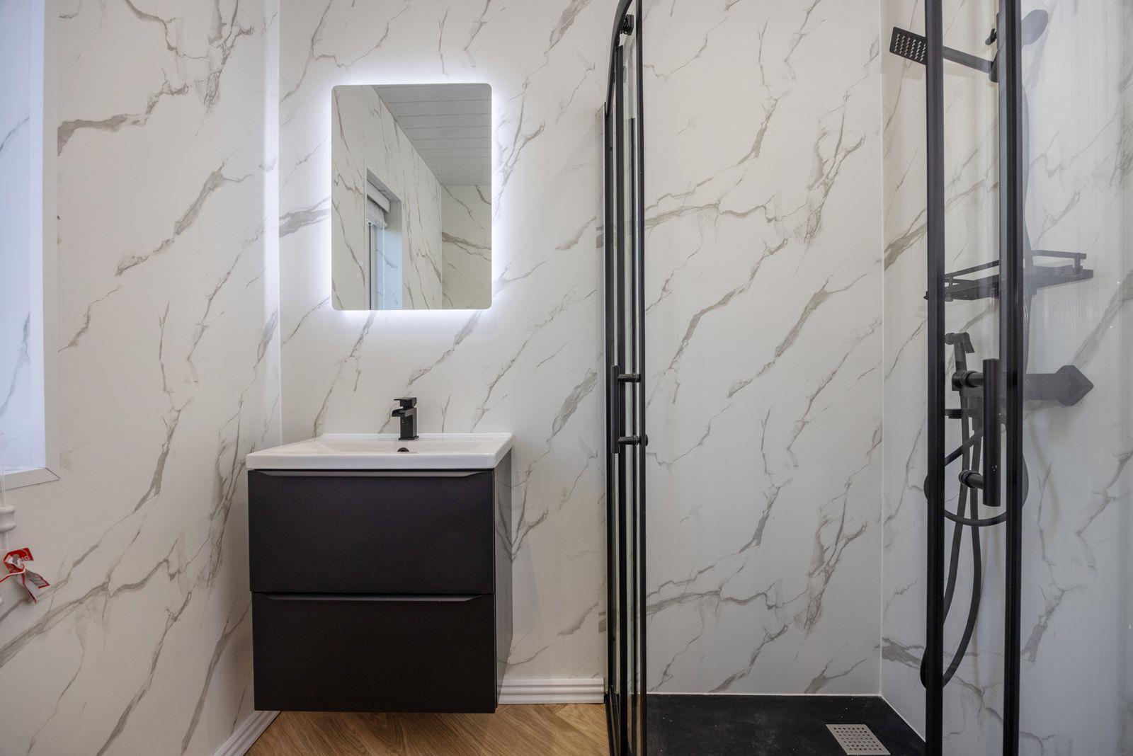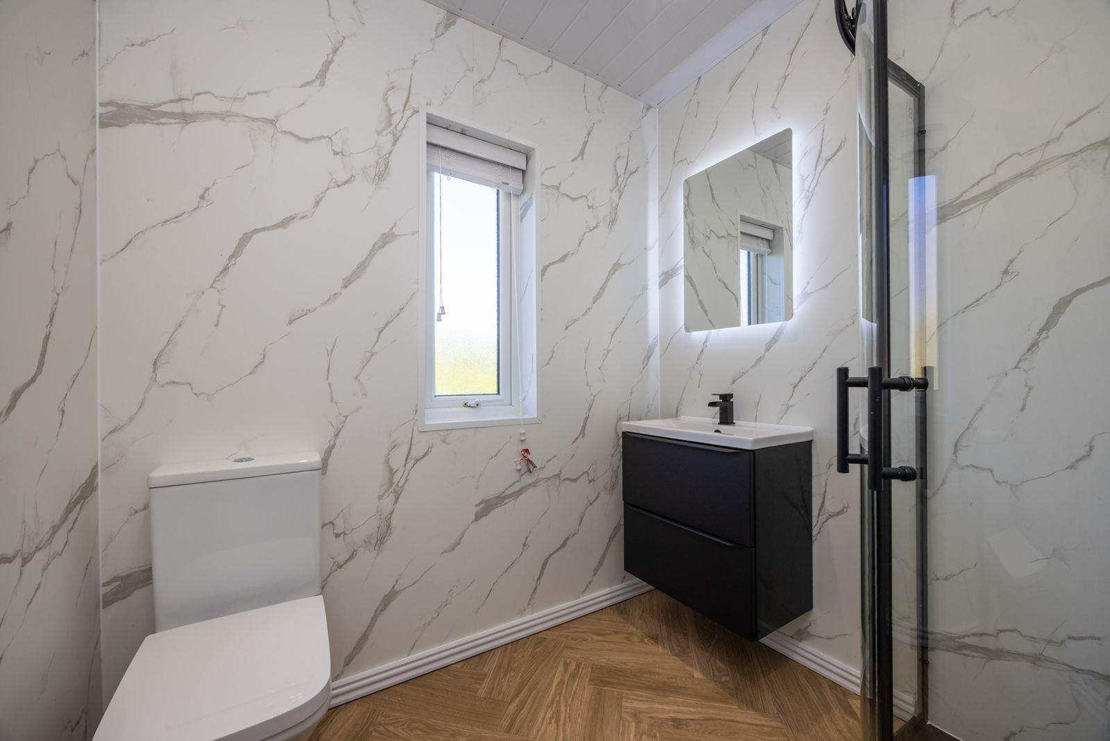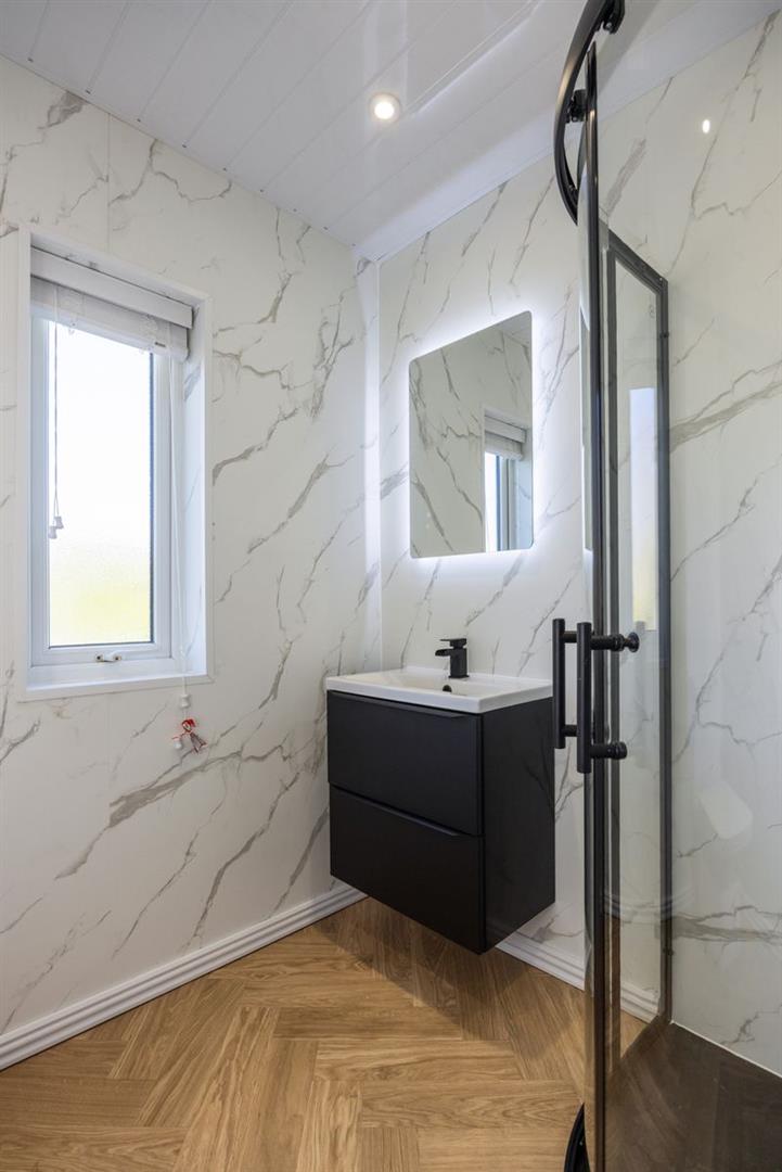 Comprising: Corner shower with thermostatic shower over and Drencher. Vanity unit with inset wash hand basin and mixer tap. W.C. Panelled walls. PVC ceiling with 4 Downlights.