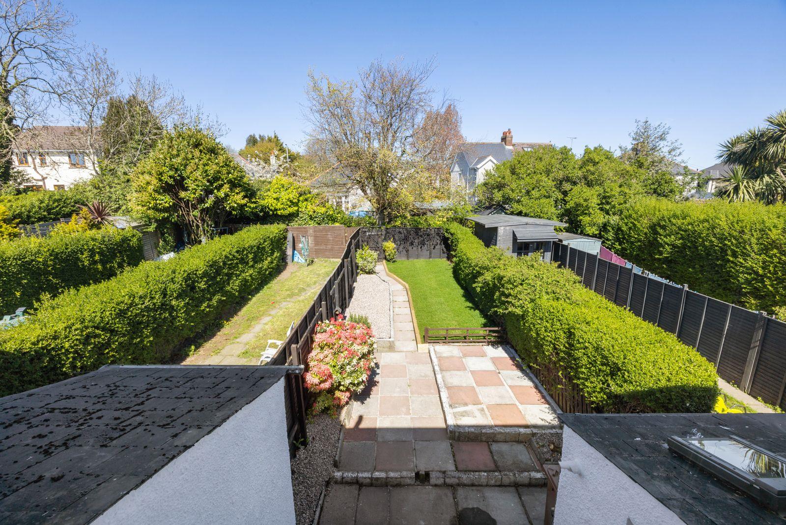 Enclosed garden in lawn with hedges and shrubs. Sensor light. Tap. Patio area.