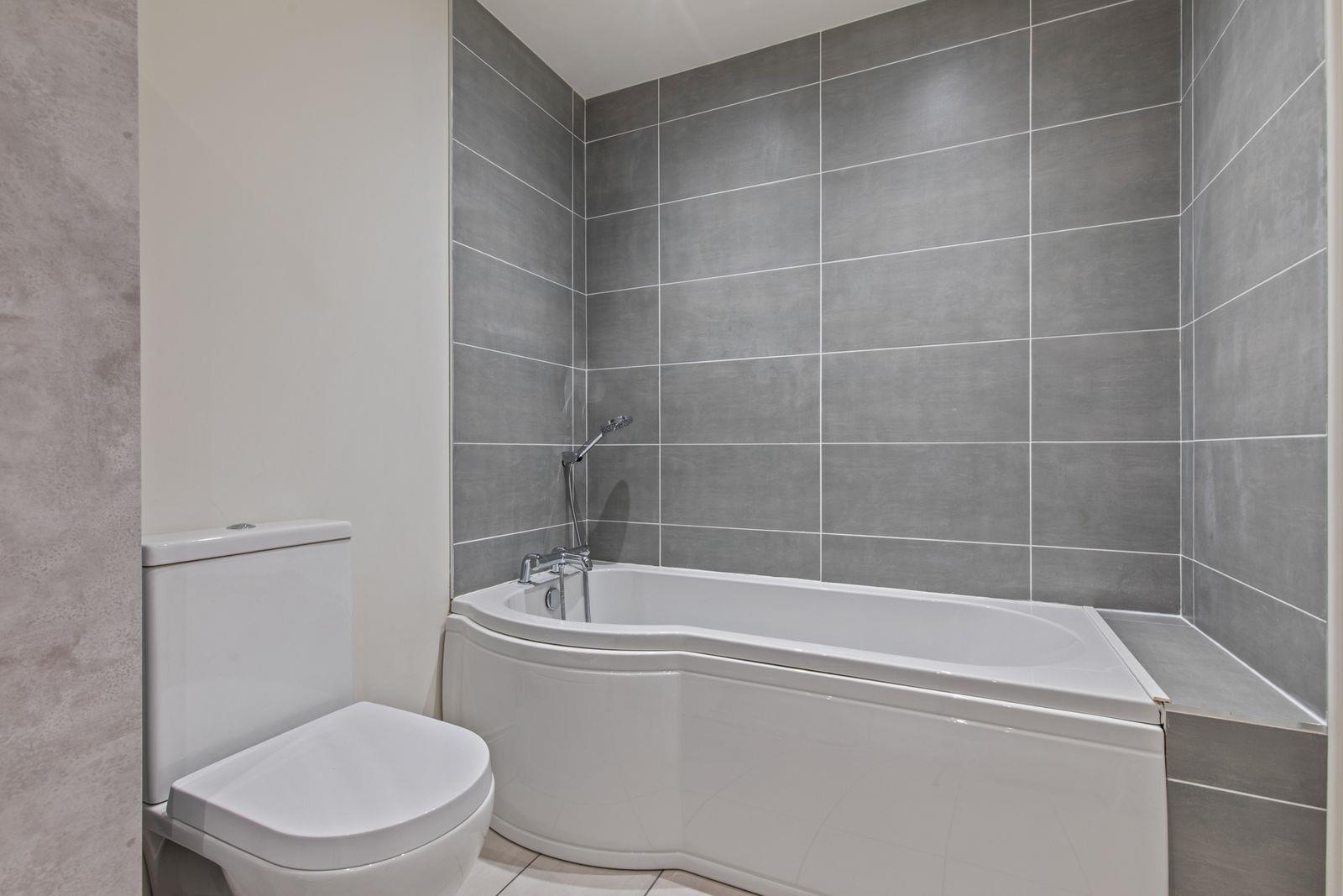 White suite comprising: Panelled bath with mixer tap and telephone shower attachment. Corner shower with thermostatic shower over and drencher. Pedestal wash hand basin with mixer taps. W.C. Part tiled walls. Ceramic tiled floor. Built-in extractor fan. Chrome heated towel rail.