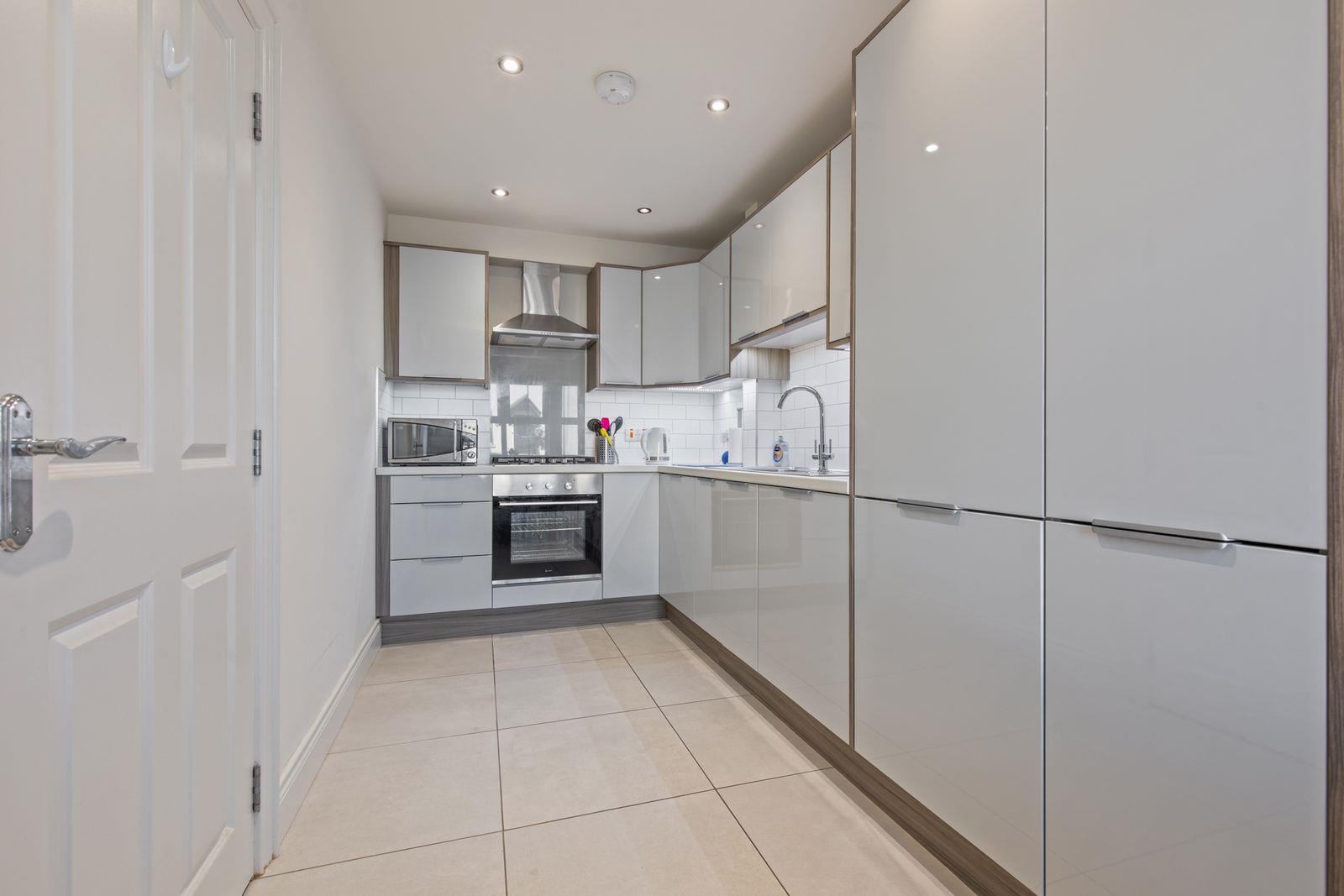 Range of high and low level cupboards and drawers with maple style trim, granite effect roll edge work surfaces. Built-in stainless steel 4 ring gas hob and oven under. Extractor canopy with integrated fan and light. 11/2 tub single drainer stainless steel sink unit with mixer taps. Integrated fridge/freezer and dishwasher. Part tiled walls. Ceramic tiled floor. 8 Downlights.