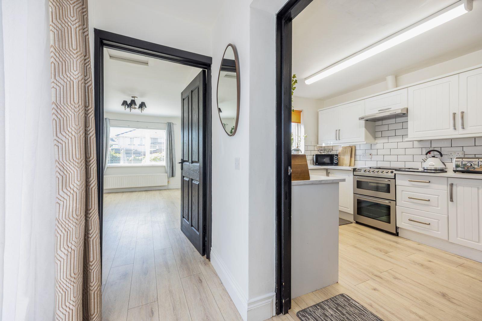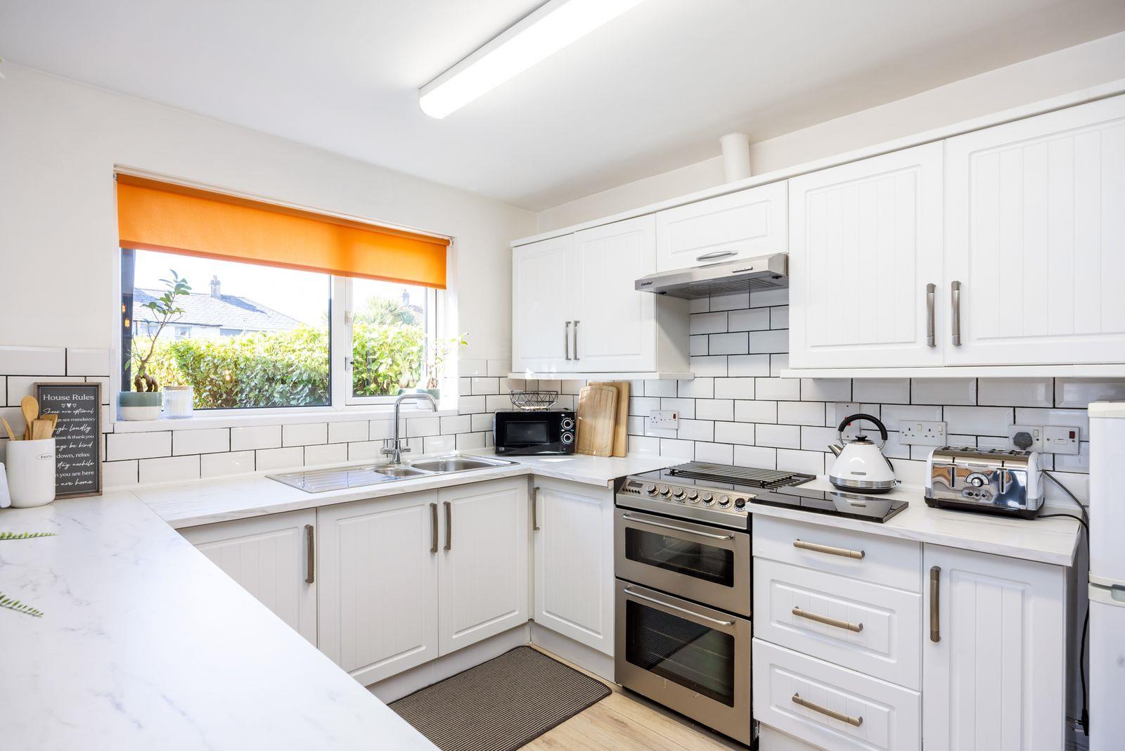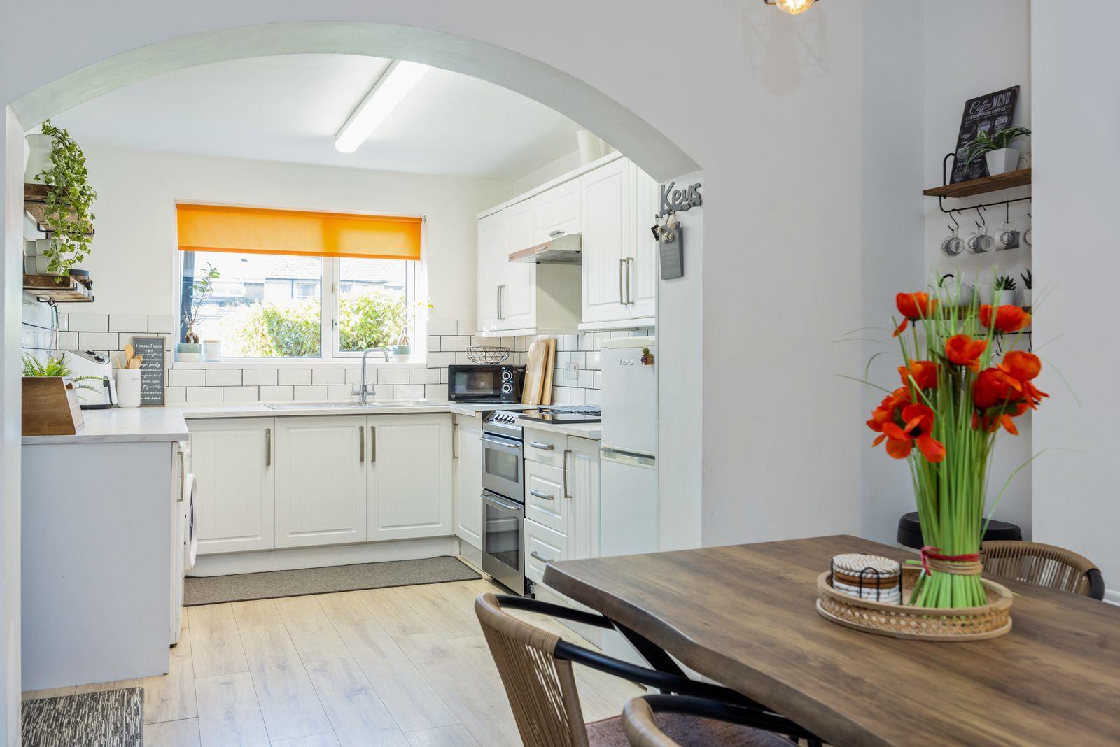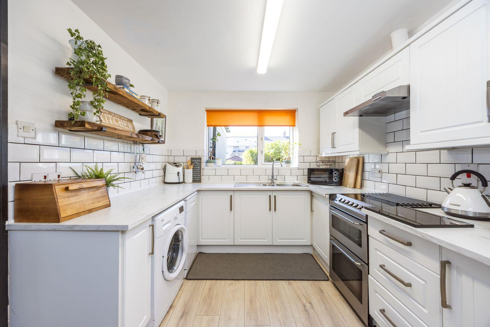 Range of white and low level cupboards and drawers with square edge work surfaces. Built-in Comfree extractor fan with light. 11/2 tub single drainer sink unit with mixer taps. Plumbed for washing machine and dishwasher. Part tiled walls.