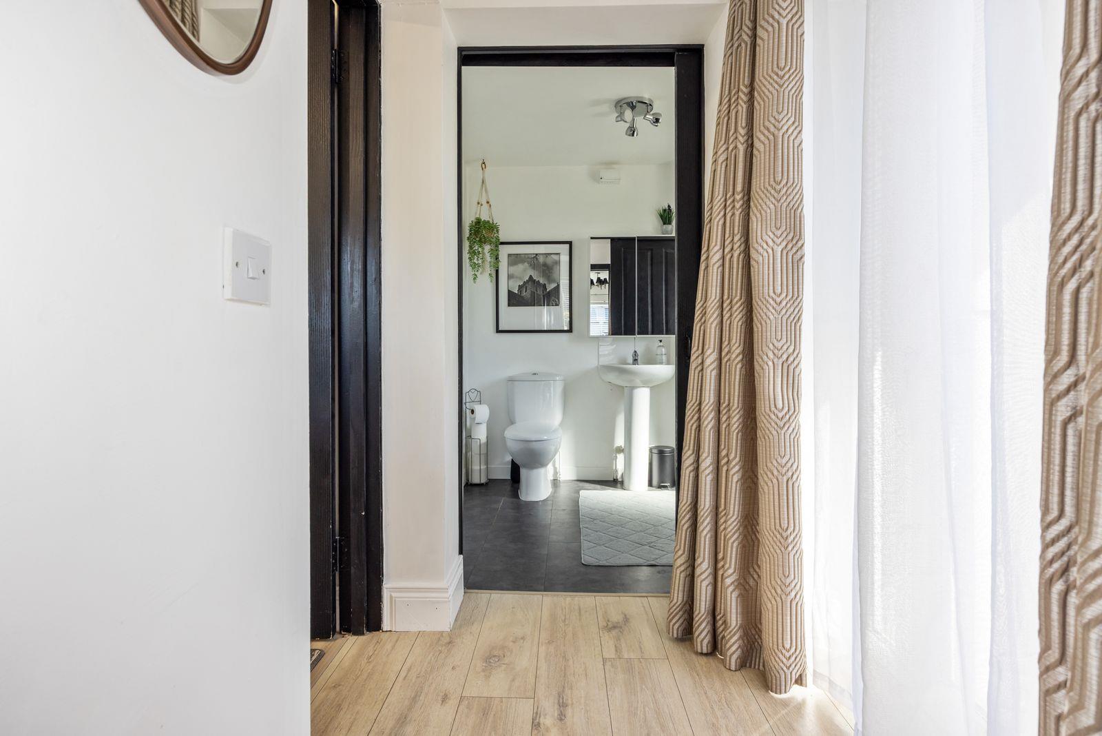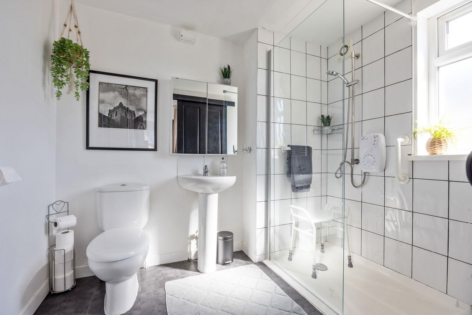 Comprising: Walk-in shower with Galaxy Aqua electric shower. Pedestal wash hand basin. W.C. Part tiled walls. Built-in extractor fan.