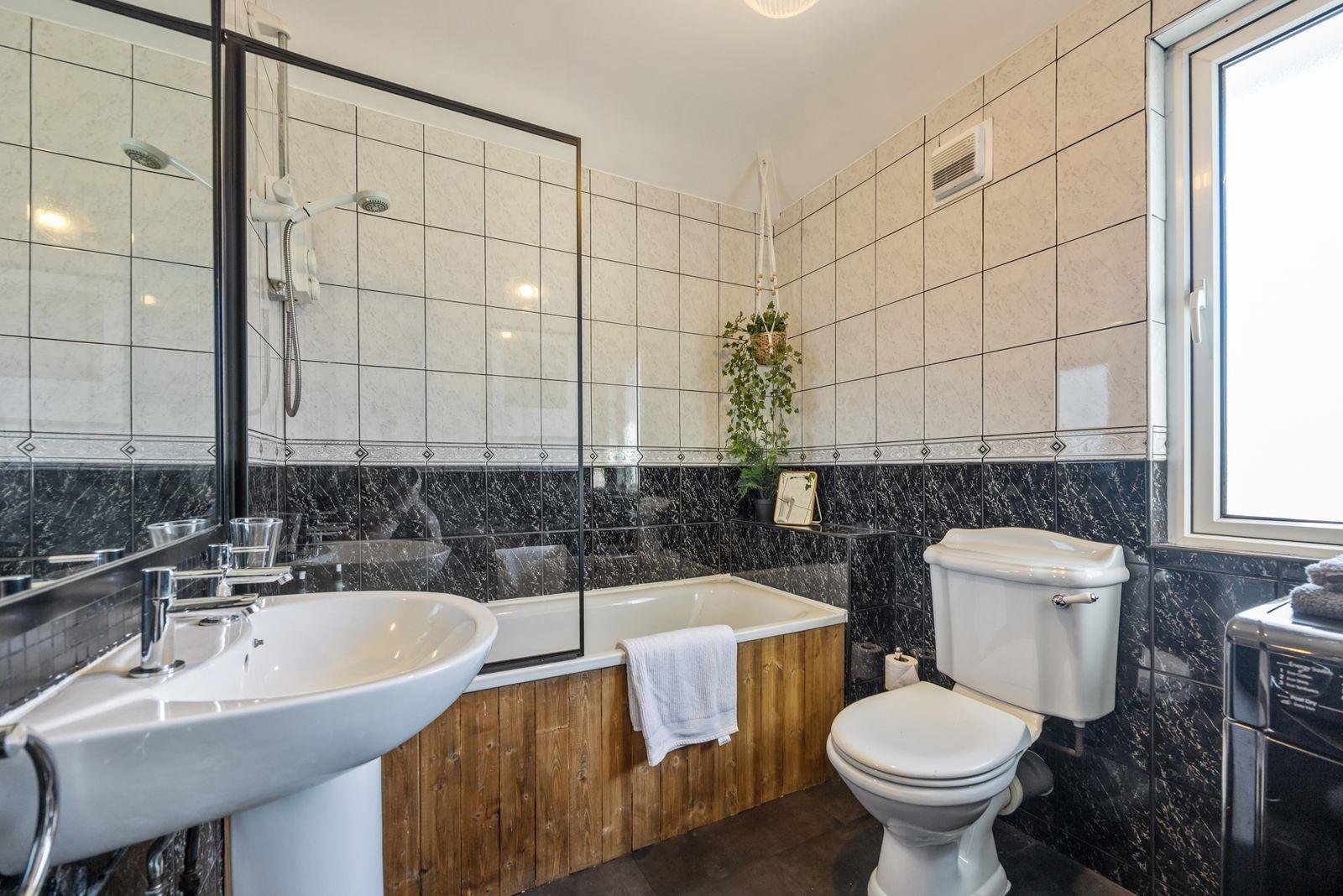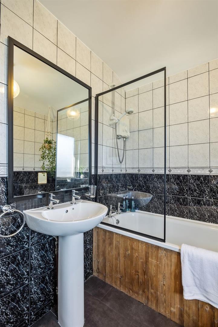 White suite comprising: Panelled bath with Gainsborough PS1200 electric shower unit. Pedestal wash hand basin. W.C. Tiled walls. Built-in extractor fan.