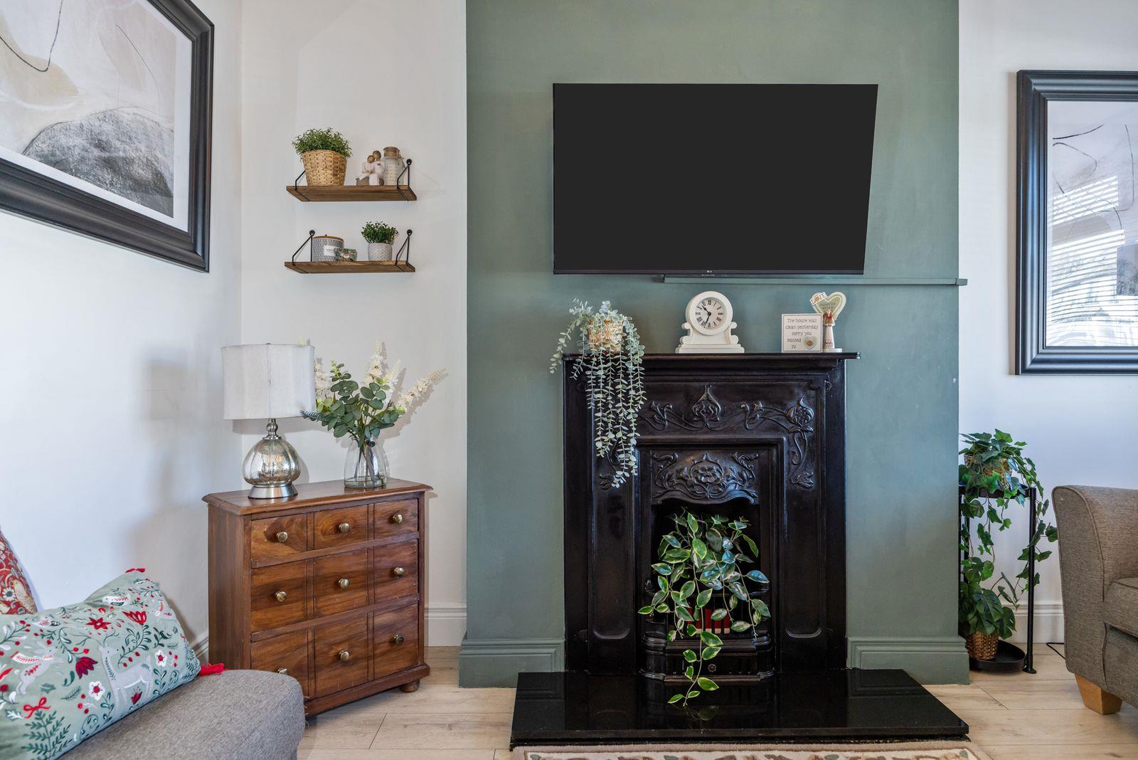 Open fireplace, cast iron surround and granite hearth. Laminated wood floor.