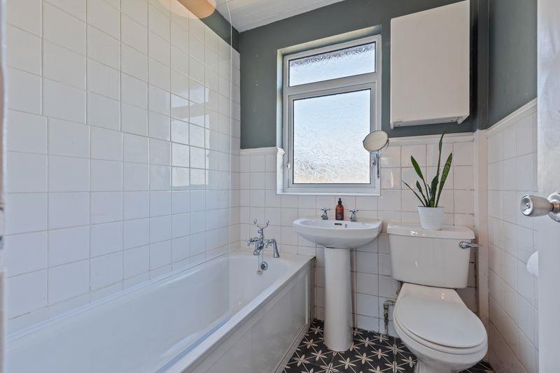 White suite comprising: Panelled bath with mixer tap. Mira Sport electric shower over. Pedestal wash hand basin. Low flush W.C. Part tiled walls. Panelled ceiling. Single panel radiator. Tiled floor. White uPVC double glazed windows.