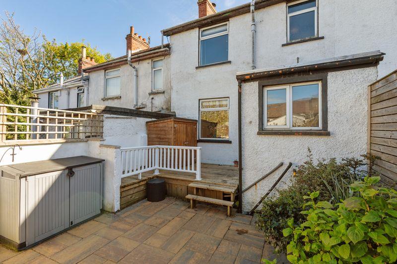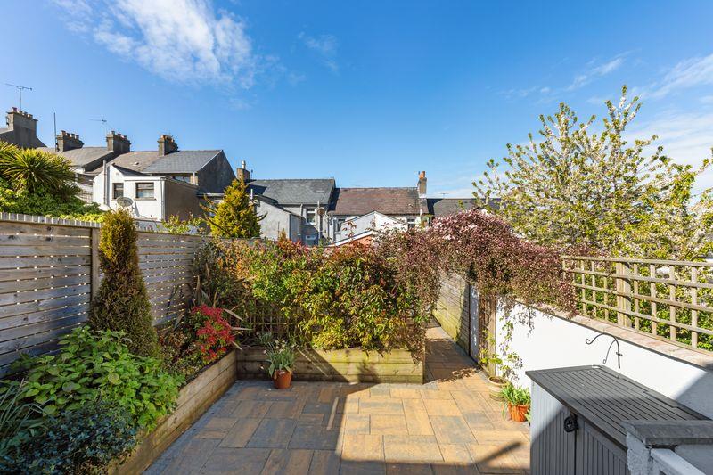 Enclosed rear garden. Mostly paved. Garden decking. Utility store on decking with washer and tumble dryer Raised borders with host of plants and shrubs. Outside light and tap. W
