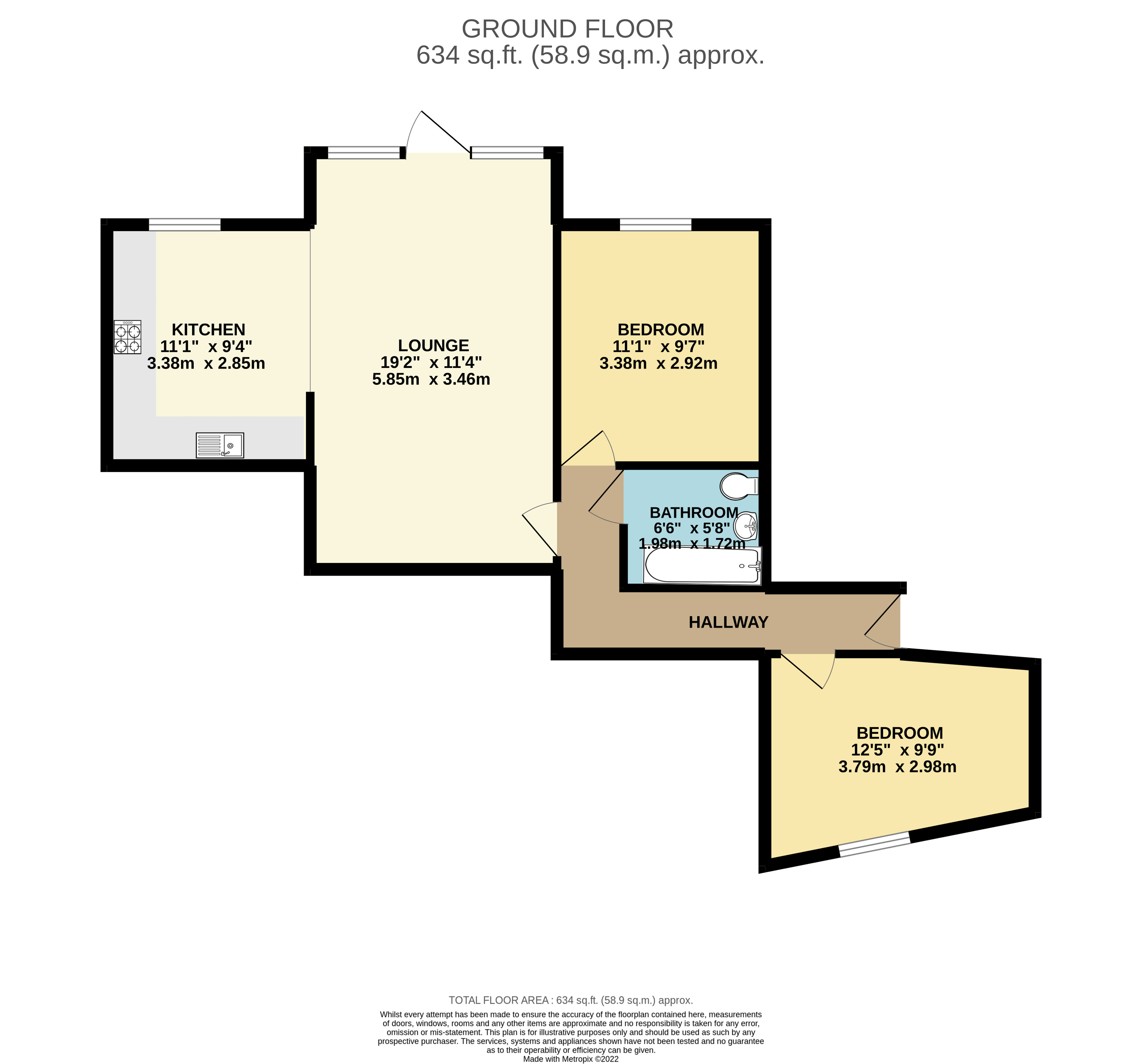 This slick ground floor apartment offers two generous double bedrooms and kitchen open to the lounge. Access via the communal Hallway or via your own glazed door directly into the spacious Lounge. Both Bedrooms are carpeted with plenty of room for furniture. The Kitchen offers a range of high and low units, gas hob, electric oven and integrated fridge, freezer, and dishwasher.